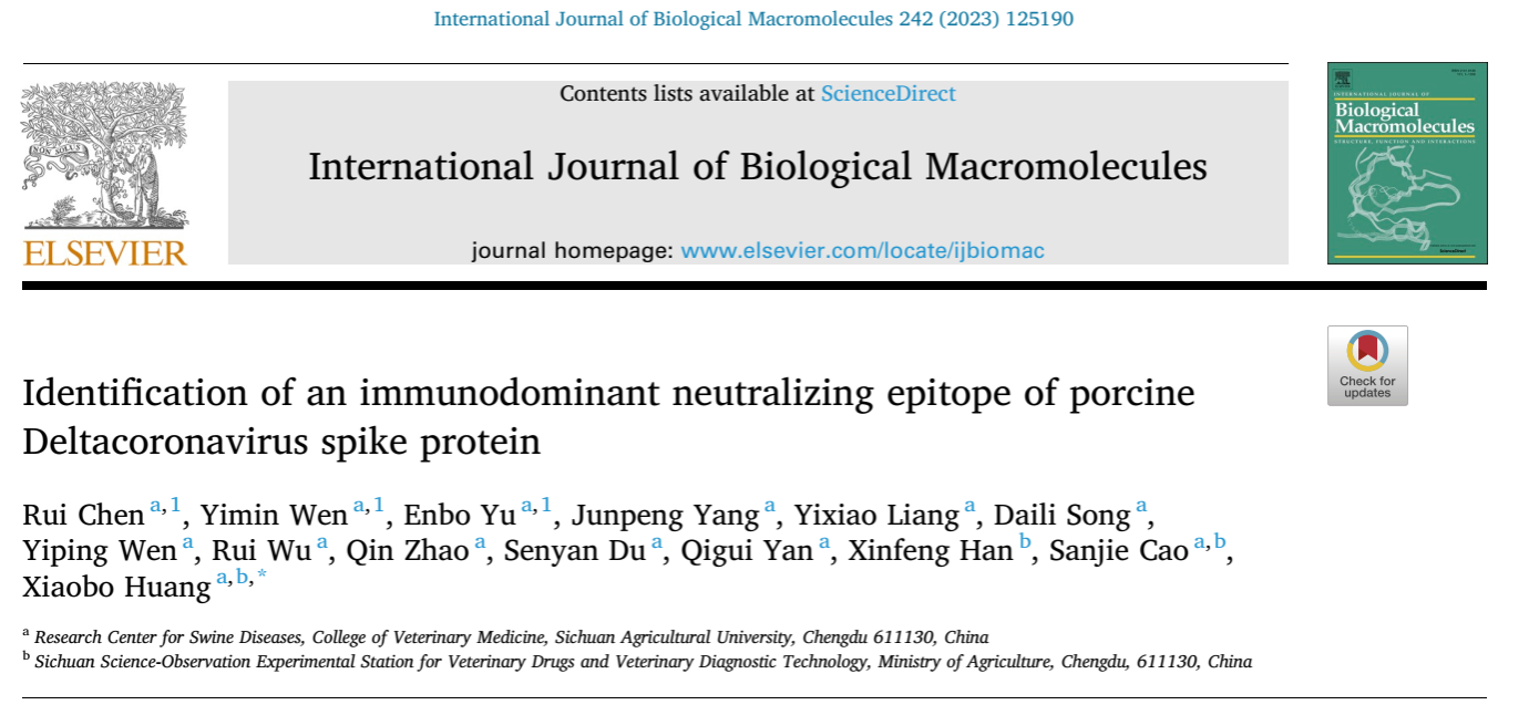 近日,bat365官方网站猪病研究中心黄小波教授团队在国际期刊《International Journal of Biological Macromolecules》(中科院1区Top期刊,2023的IF为8.025)发表题为“Identification of an immunodominant neutralizing epitope of porcine Deltacoronavirus spike protein”的研究论文。研究系统报道了猪δ冠状病毒(Porcine Deltacoronavirus,PDCoV)S蛋白一个免疫优势中和抗原表位的发现、鉴定及动物免疫原性评价等相关研究。