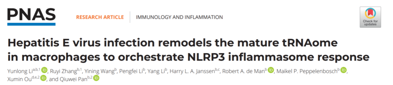 近日,bat365官方网站动物医学免疫学研究团队与荷兰伊拉斯姆斯大学医学中心等多家研究机构合作在PNAS(美国科学院院刊)上发表了题为“Hepatitis E virus infection remodels the mature tRNAome in macrophages to orchestrate NLRP3 inflammasome response”(戊型肝炎病毒感染重塑巨噬细胞中的成熟tRNAome以协调NLRP3炎症小体的激活)的研究论文。该研究揭示了戊型肝炎病毒(HEV)感染如何操纵巨噬细胞中的炎性小体激活机制。研究结果显示,HEV通过改变巨噬细胞中的成熟转运RNA组(tRNAome)来调控NLRP3炎症小体的激活。