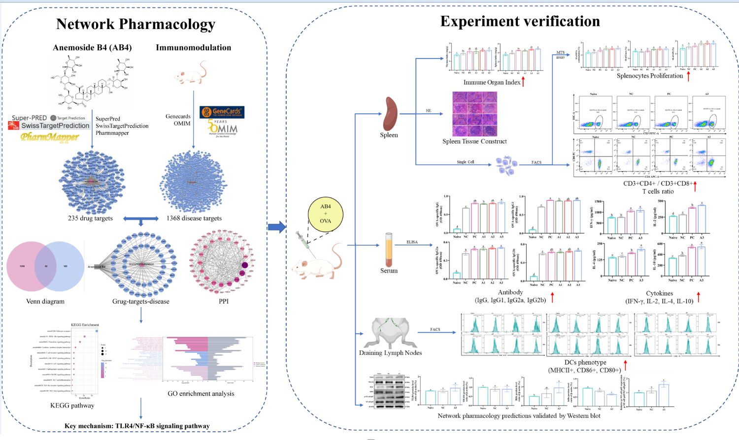 近日,bat365官方网站临床兽医学系研究成果“Exploration of the immuno-adjuvant effect and mechanism of Anemoside B4 through network pharmacology and experiment verification”(通过网络药理学结合试验验证探究白头翁皂苷B4的免疫佐剂作用及其机制)在国际著名期刊《Phytomedicine》(一区TOP,IF=7.9)在线发表(原文链接:https://doi.org/10.1016/j.phymed.2023.155302)。这项研究首次全面研究了中药白头翁提取物——白头翁皂苷B4在疫苗佐剂领域的作用机制。这项研究结果为白头翁皂苷B4在动物疫苗的临床应用提供了重要的科学依据,为提高疫苗免疫效果开辟了新的研究思路。