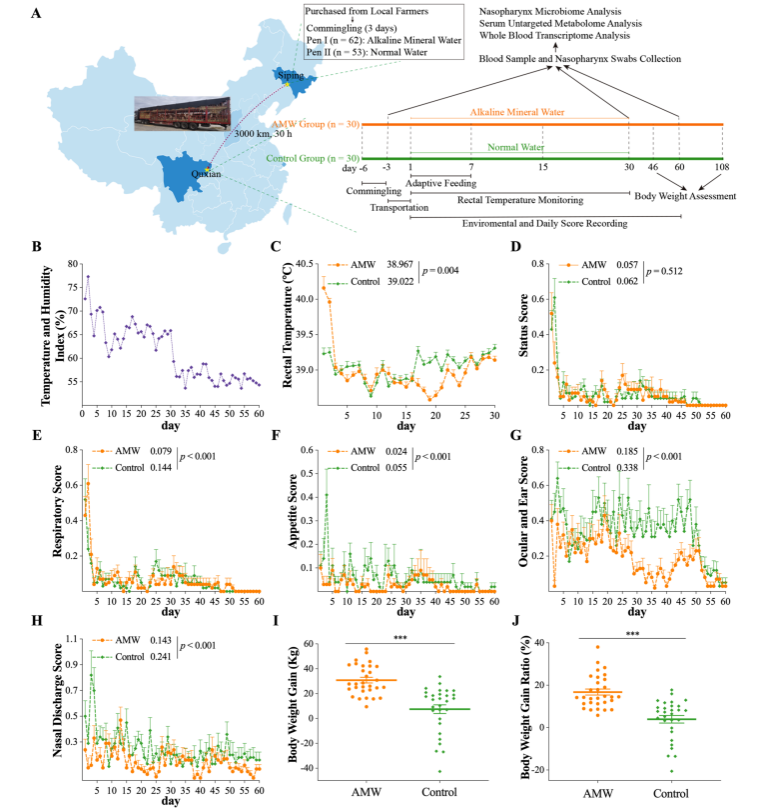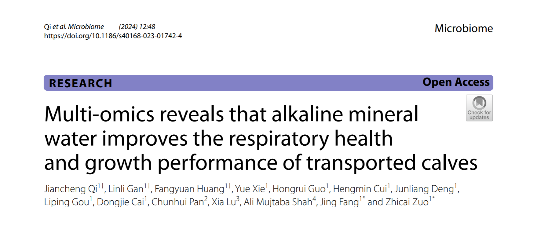 近日,bat365官方网站左之才教授研究团队在国际顶级期刊《Microbiome》(中科院JCR 1区,影响因子15.5)上发表了题为“Multi-omics reveals that alkaline mineral water improves the respiratory health and growth performance of transported calves”的研究论文,这项研究为有效缓解犊牛运输应激提供了一种实用的方法,并深入探索了其潜在的机制,为畜牧业的可持续发展提供了有力支持。