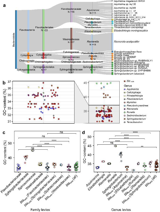 研究团队进一步通过生物信息学分析并发现了46个blaRATA类基因,编码27种变体,涉及21个不同物种,包括病原体、宿主相关细菌和环境分离菌。尤其值得关注的是:携带blaRATA基因的菌株已在全球范围分布,并且主要源自海洋环境。此外,blaRATA基因主要位于黄杆菌科细菌的染色体上,与黄杆菌科内菌种具有相似的GC含量,表明黄杆菌科可能是blaRATA基因的主要储库。