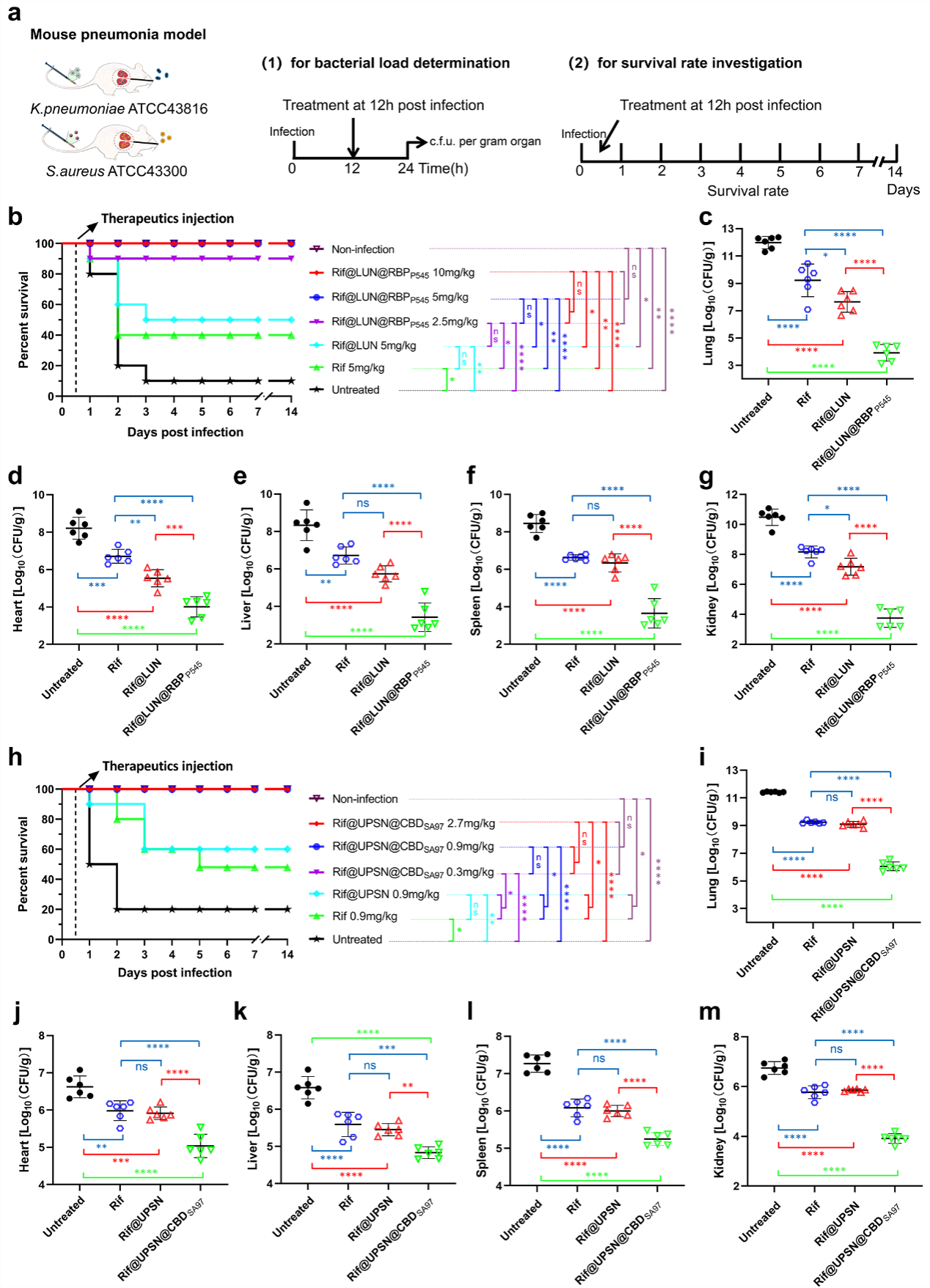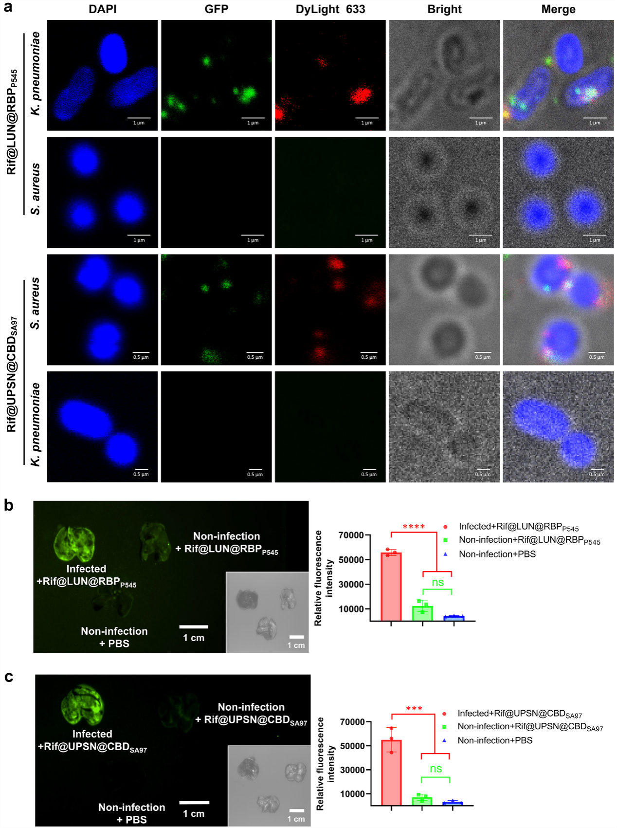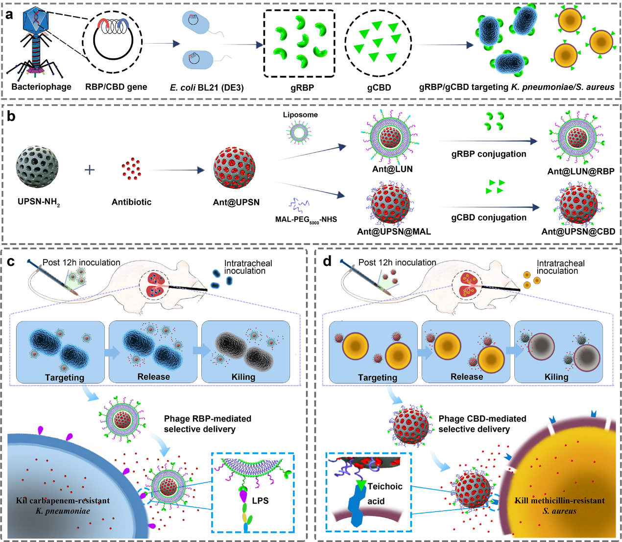 为有效应对耐药菌感染的问题,该研究首创了以病原菌特异性噬菌体受体结合蛋白(Receptor-binding proteins,RBPs)和内溶素细胞壁结合域(Cell-wall binding domains,CBDs)作为药物递送系统靶向模块实现抗生素体内精准高效递送的新策略。研究以基因工程手段获得的肺炎克雷伯菌噬菌体RBP和金黄色葡萄球菌噬菌体内溶素CBD作为纳米药物载体的靶向模块,分别将抗菌药物精准高效递送至了肺炎克雷伯菌和金黄色葡萄球菌感染的小鼠肺部,显著提高了抗生素的治疗效果。