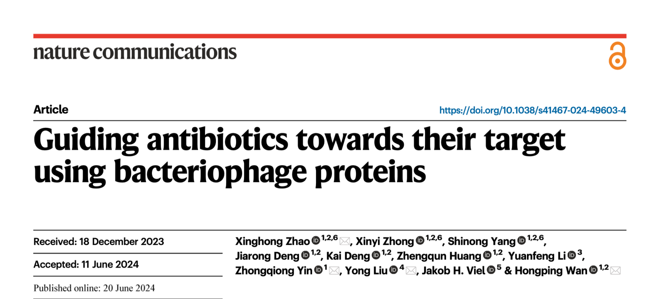 6月20日,国际顶级学术期刊《Nature Communications》在线发表了bat365官方网站赵兴洪/万红平团队题为“Guiding antibiotics towards their target using bacteriophage proteins”的研究论文,该研究成果成功实现了利用噬菌体蛋白介导抗生素高效靶向病原菌,为细菌耐药性防控提供了新策略。