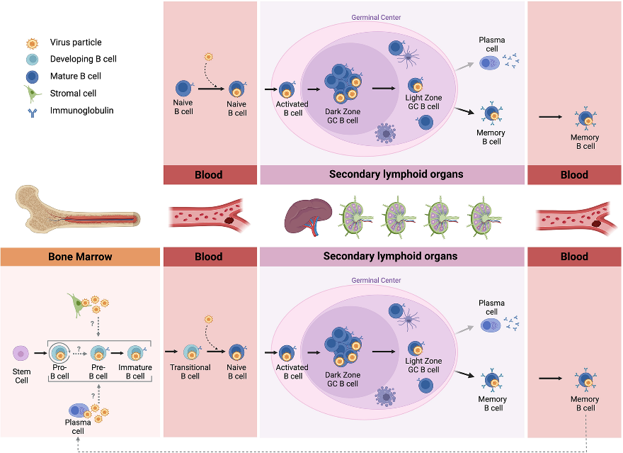 致癌性γ疱疹病毒,包括人EB病毒(EBV)、人卡波西肉瘤相关疱疹病毒(KSHV)和鼠γ疱疹病毒68(MHV68),能在循环B细胞中建立终身潜伏感染,并可直接引发B细胞淋巴瘤等多种恶性肿瘤。目前主流观点认为,γ疱疹病毒首先感染初始B细胞(naïve B cell),然后以抗原非依赖的方式驱动感染的B细胞通过生发中心反应分化为记忆B细胞(memory B cell),病毒就长期潜伏在记忆B细胞中。王一平博士和Scott Tibbetts教授将本实验室以及其他科学家在发育B细胞(developing B cell)研究中取得的研究成果整合到现有γ疱疹病毒潜伏感染的模型中,提出一种全新的范式:γ疱疹病毒除了感染初始B细胞外,还可以通过感染骨髓中的发育B细胞,然后驱动感染的B细胞经过正常的B细胞成熟和分化途径,最终形成稳定保持潜伏病毒基因组的记忆B细胞区。
