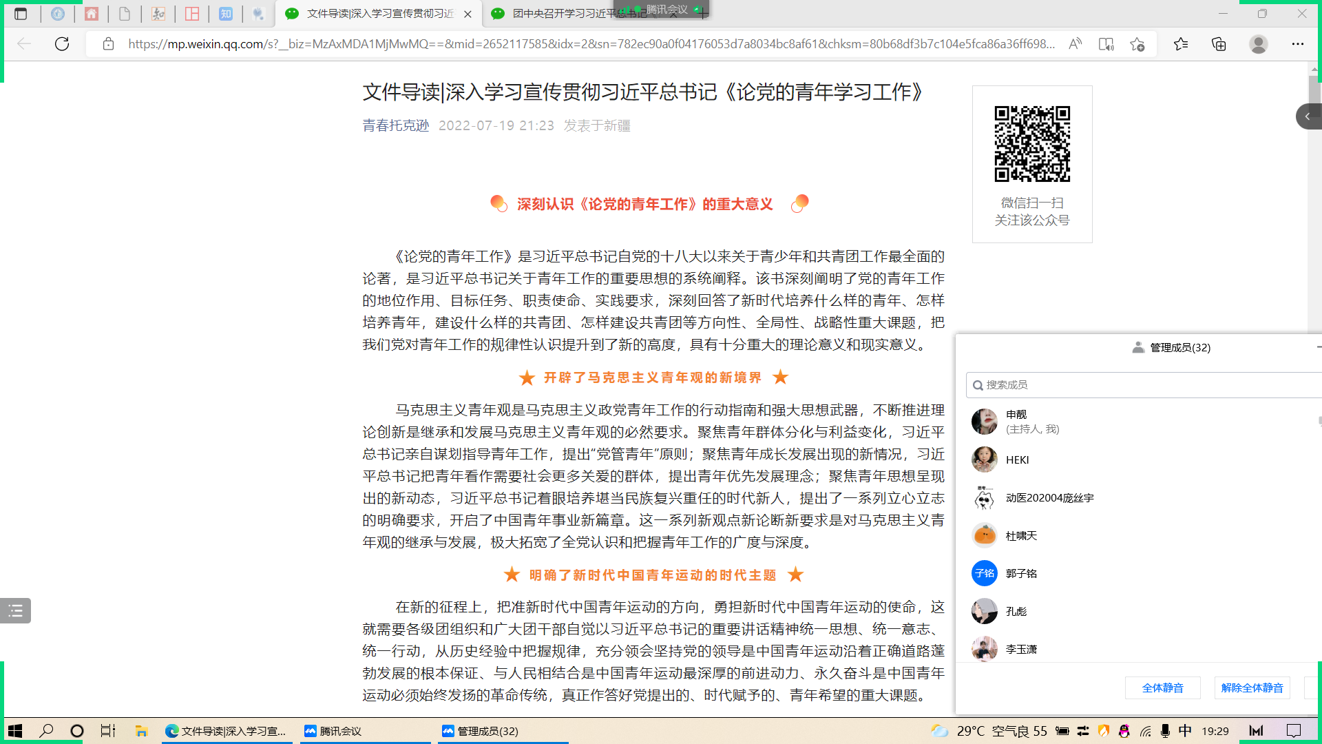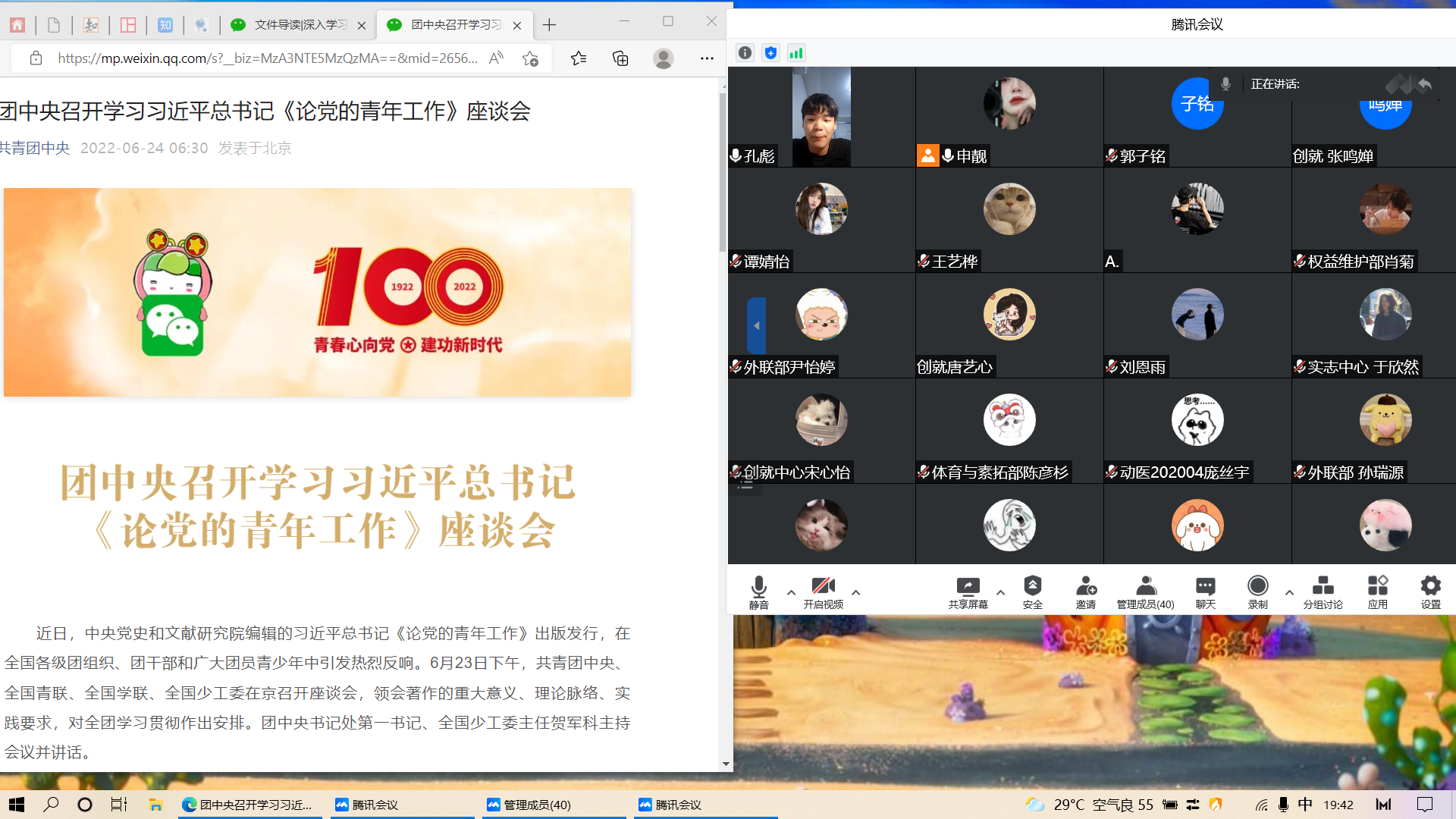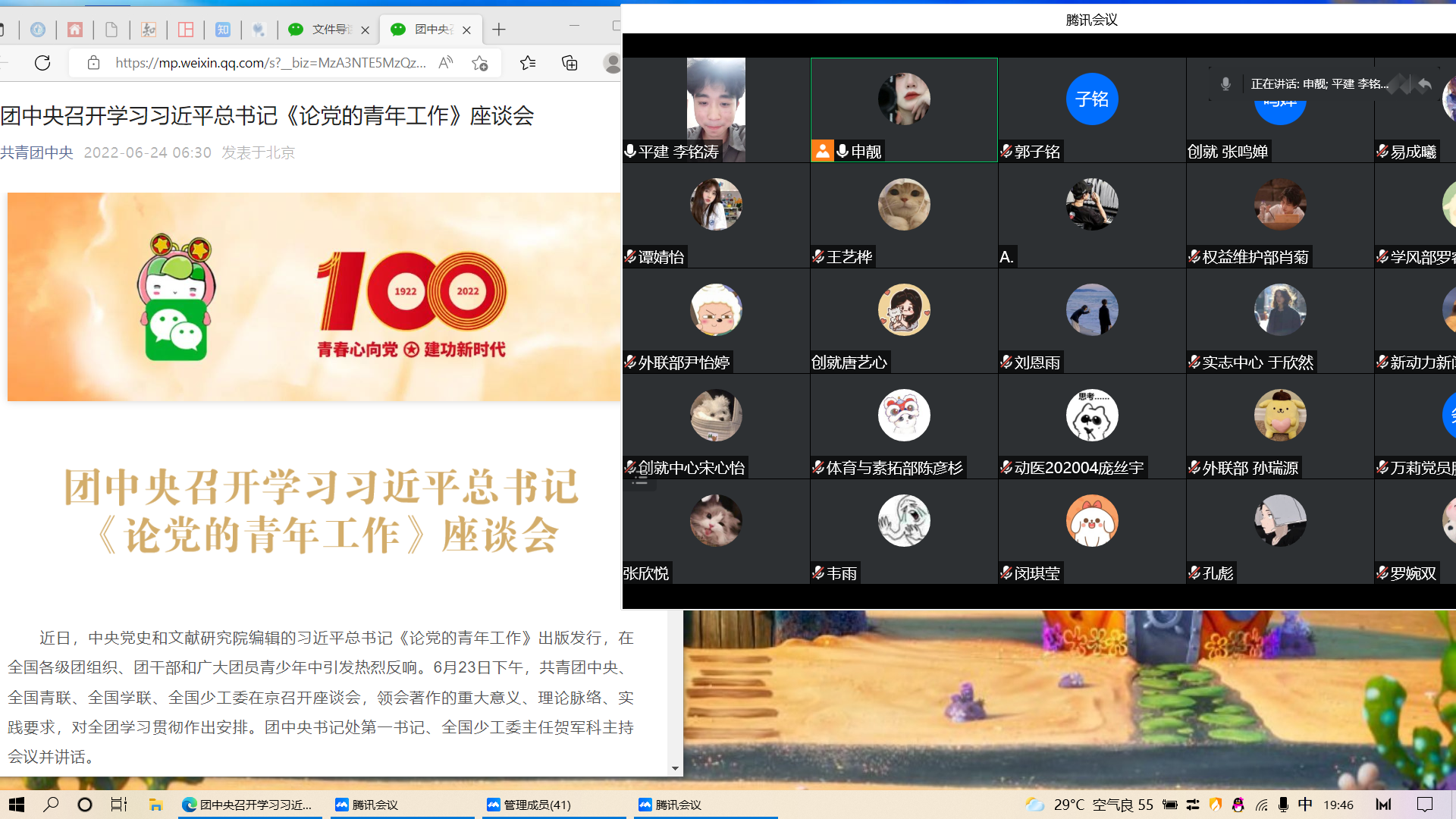 7月29日,动医院团委学生会于线上组织学生干部们开展了深入学习习近平总书记《论党的青年工作》著作,深刻领悟习近平总书记对青年的殷切期望,学习对青年的思想指导。