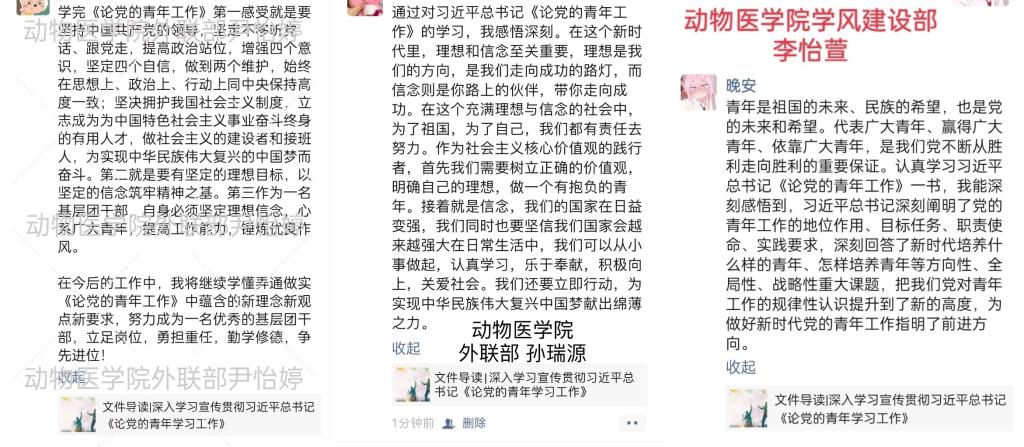 学习结束后,动医学生干部们纷纷于线上进行了心得分享,表示本次学习受益匪浅,而且还表示会在生活中带领身边的人一起学习并运用于实际中,以起到先锋模范作用。同时在暑假特殊时期,动医院青年学子都在积极开展社会实践,通过对《论党的青年工作》深刻领悟学习,无疑会对接下来的社会实践起到思想上的指导性、引领性作用。