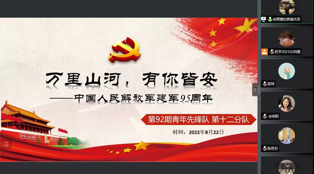 822183092期青年先锋队第十二分队在线上开展了八月的时政学习,本次时政学习的主题为“万里山河,有你皆安——中国人民解放军建军95周年”,学习共分为四部分,分别为建军节史学习教育,建军故事、影片分享,建军知识竞答,学习感想及祝福的收集。