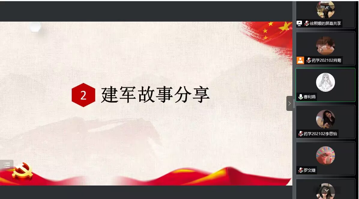 据悉,在学习建军节来源与背景后,主持人徐熙媛播放了与八一建军节相关的视频,这些影片向中国人民解放军建军95周年而庆祝,也向中国人民解放军致以最崇高的敬意。在这些影片中,分队成员感受到了中国人民解放军的铁血军魂,以及他们“寸土不让,护我神州”的坚定决心。欣赏建军95周年庆祝视频后,徐明阳、肖菊、曹丽娟三位成员向分队成员进行了的建军故事与影片分享,这些感人故事中,有自己身边发生的事情,有令人深刻的建军故事,通过三位同学建军故事及经典影视作品的分享,分队成员对于中国人民解放军有了更深刻的理解与认识。