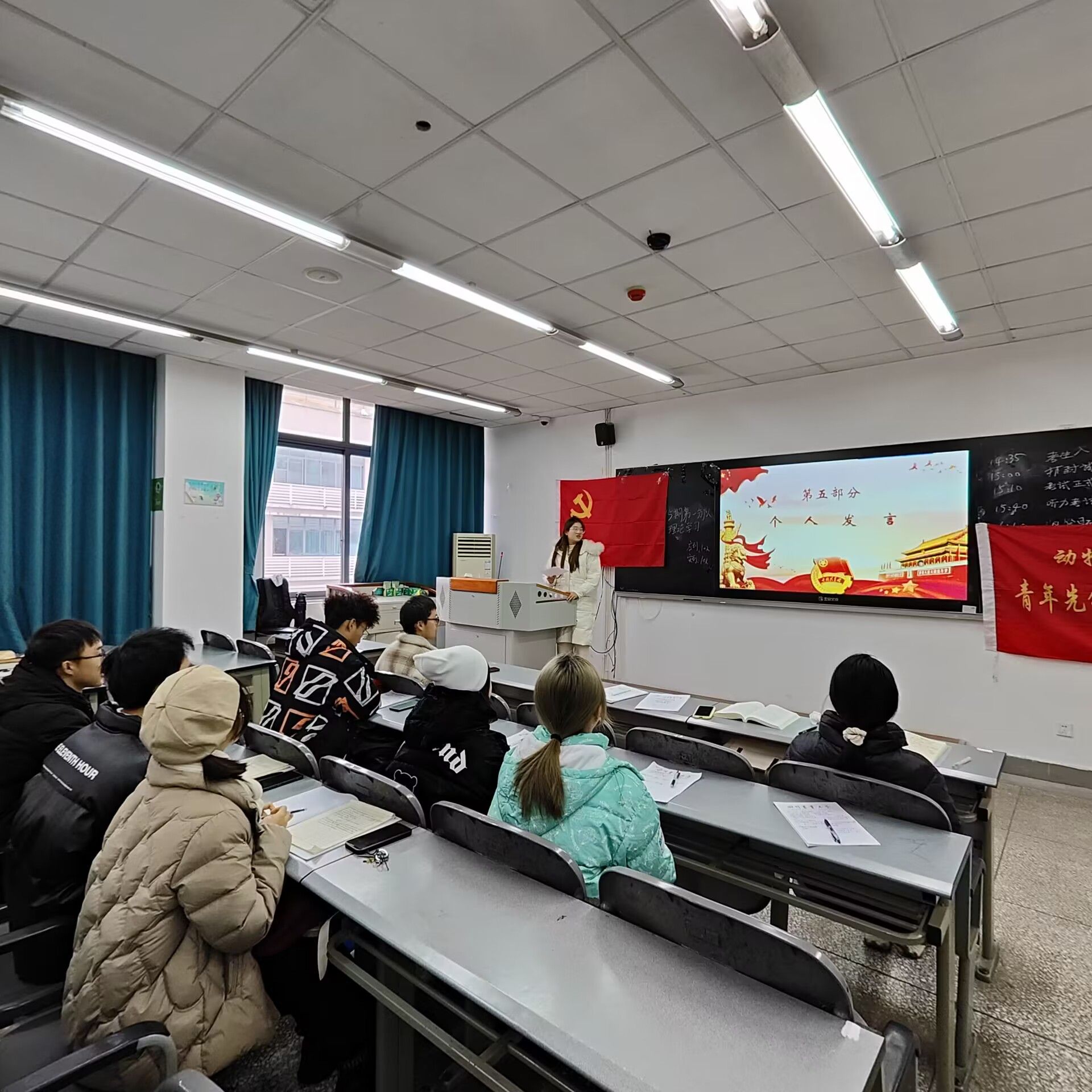 在理论学习后,分队成员又进行了小组讨论和个人发言。在小组讨论中,成员们提出了一些有关党员发展流程的问题,经过大家的积极交流,这些问题都得到了有效解决。然后就是个人发言环节,分队成员就此次理论学习内容进行自己的感悟分享。其中蒋雨佳同学提到她在此次学习中收获颇深,不仅详细了解到中国共产党发展党员工作细则及流程,还认识到自身的不足所在,因此她也会在以后的学习过程中不断依照准则来完善自己。