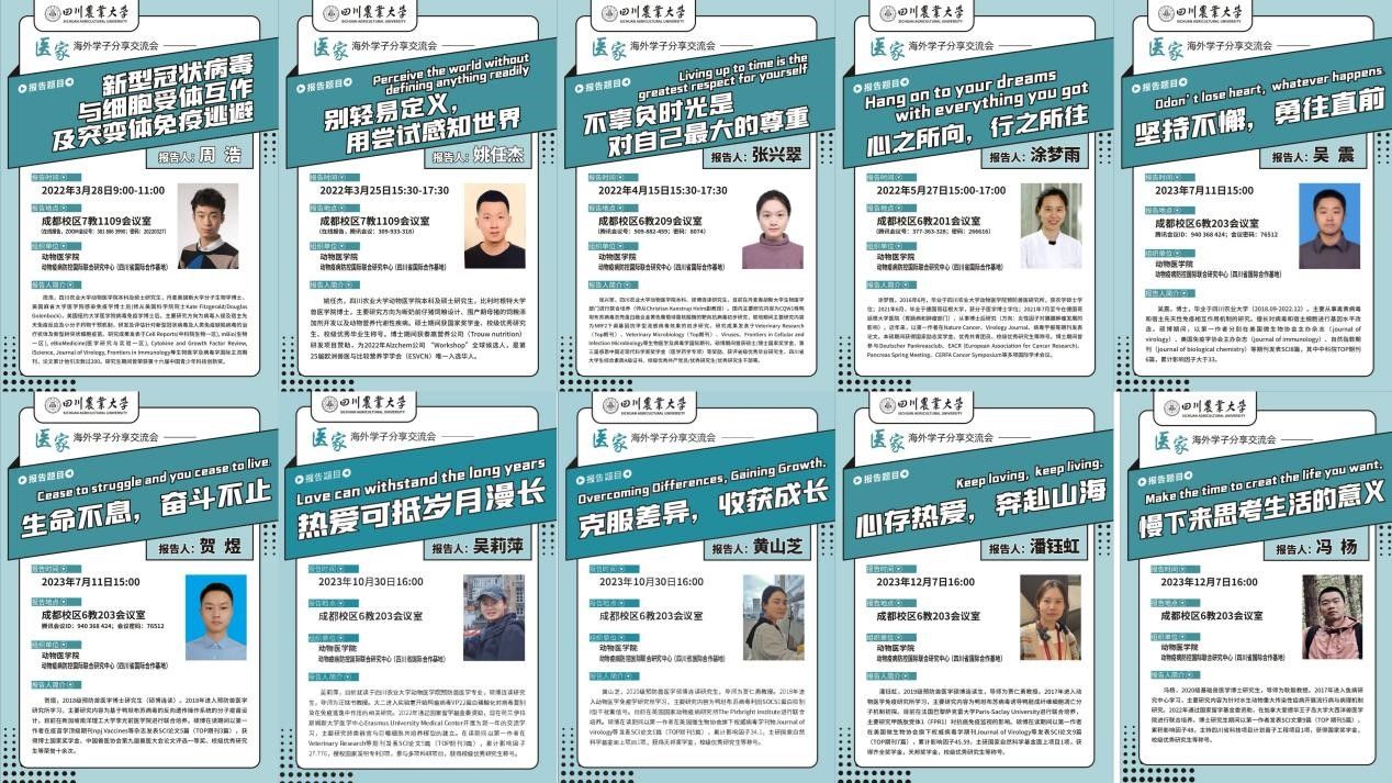 作报告的海外学子多人在读期间曾获国家奖学金、“省级优秀毕业研究生”、“校级优秀研究生”、“四川省大学生综合素质A级证书”等荣誉,多人具有美国麻省大学医学院、纽约大学医学院、德国哥廷根大学博士后经历,毕业后,入职于bat365官方网站、成都中医药大学、西南大学、川北医学院等高校,投身教育科研事业。其中周浩博士曾获第十六届中国青少年科技创新奖,以川渝共建感染性疾病中西医结合诊治重点实验室海外引进人才入职成都中医药大学医学技术学院,担任基础医学院教授和博士研究生导师。吴震博士毕业后以副教授身份入职bat365官方网站,并主持1项国家自然科学基金青年项目,主研国家级科研项目3项。