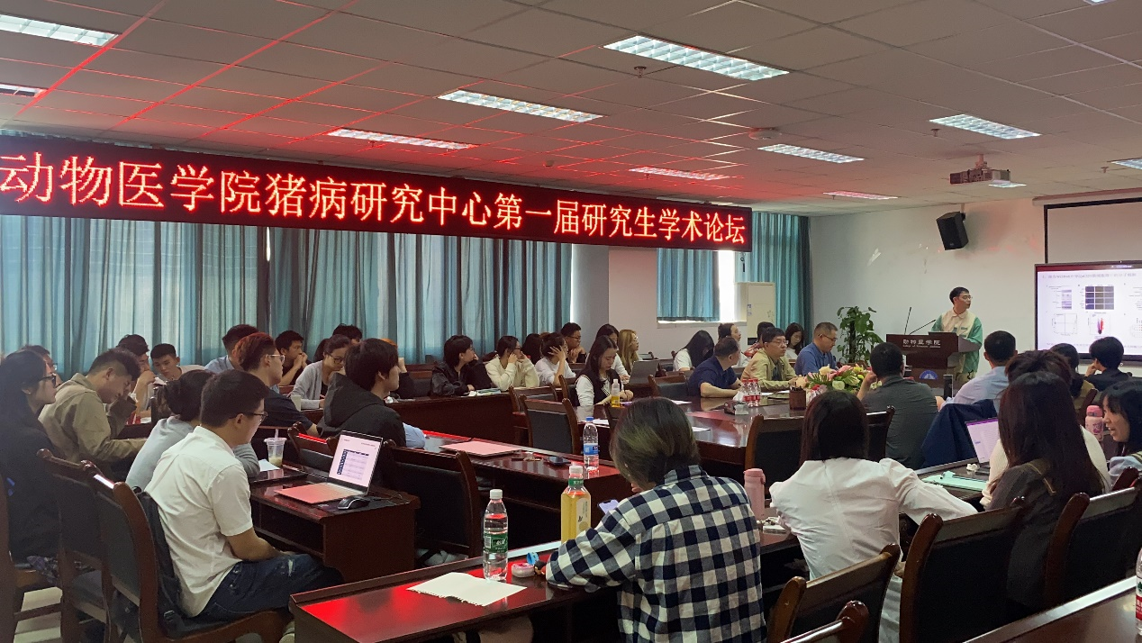 论坛自4月1日发布通知起,便得到了中心师生的广泛关注和积极参与。经过初步评审选拔,12名选手脱颖而出进入最终学术论坛汇报环节。学术论坛评审委员会由学校教务处处长兼猪病中心主任曹三杰教授、预防兽医系主任兼猪病中心副主任黄小波教授及猪病研究中心杜森焱教授、王一平教授、伍锐副教授、赵勤副教授、文翼平副教授、赵珊博士等8名专家学者组成,猪病研究中心全体研究生70余人参加了此次论坛。