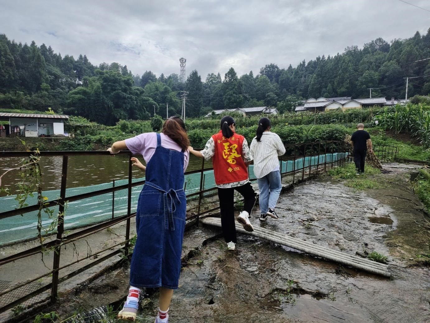 (图为团队成员到基地鱼塘实地调研)