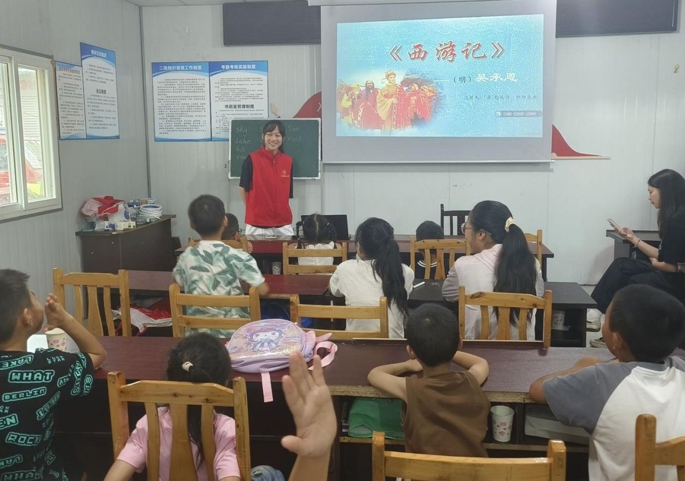 在夏令营活动初期,虽然团队成员带着满腔热情,早已准备好了教案以及所需材料,但困难总是不可避免的:教室长期未使用而杂乱不堪、同班内孩子们年龄性格差异过大、团队成员初来乍到需要与此处磨合。这些困难随着团队的每日例会总结以及不断学习修正而被克服。团队在该班级推行积分制度,奖惩并行,同时因材施教,对部分孩子使用其他方法管理,与孩子们磨合出了更好的交流与讲课方式,使整个夏令营活动有序步入正轨。