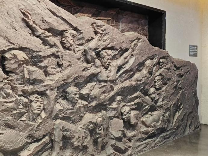 重庆大轰炸惨案遗址展馆中,首先映入眼帘的是巨大的雕塑群像,它们生动地再现了那个时代普通人民在炮火中挣扎求生的场景,让张琼丹和侯若天仿佛穿越时空回到了那个年代。每一块断壁残垣都在诉说着不屈与抗争的故事。重庆大轰炸是抗日战争期间的一段血泪史,记录了无数同胞的牺牲与抗争。站在遗址前,成员们仿佛看到了那段艰苦卓绝的历史,心中涌起了深深的敬意。