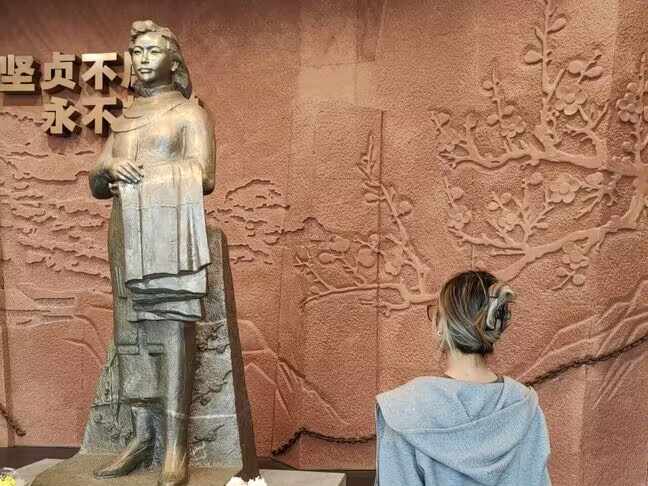 (图为团队成员参观江姐雕像)