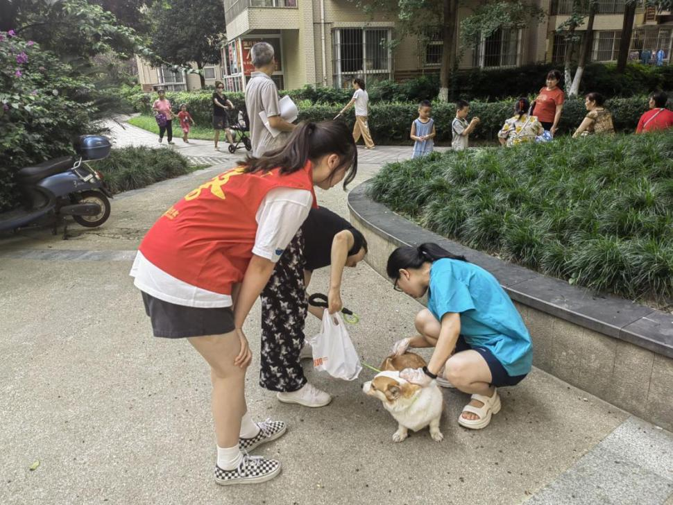 在周紫峣老师和苟丽萍老师的带领下,志愿者们为社区居民的宠物提供了包括体格检查、疫苗接种咨询、驱虫和绝育建议等在内的医疗服务。此外,志愿者们还通过发放“养宠入门手册”宣传册,向居民普及了动物疫病防治和科学养宠的相关知识,以提高他们对宠物健康的关注。