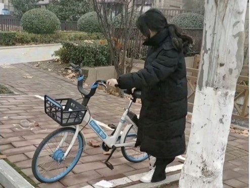 (图为团队成员黄晶晶使用共享单车)