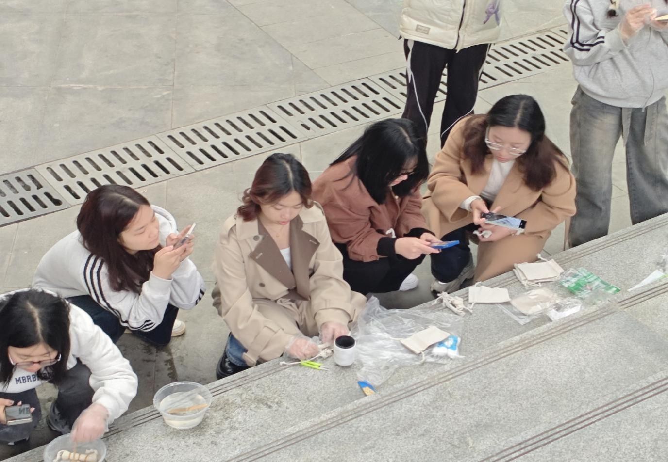 3月28日的扎染现场,志愿者围坐在一起,手中的橡皮筋与棉线化身“魔法棒”,在帆布上缠出花瓣、格子、螺旋等造型。“原来扎染不是简单染色,捆扎的松紧、染料的浓淡都会影响图案!”第一次接触扎染的志愿者叶睿桐一边给布料“扎小辫子”,一边感叹传统工艺的精妙。染料在白布上晕染开时,有人惊喜于“冰裂纹”的自然天成,有人专注调配渐变色块,原本素净的帆布渐渐绽放出独一无二的图案——有象征希望的太阳纹,有灵动的波点组合,还有用线条勾勒的小动物轮廓,仿佛把春天的生机都“染”进了布料里。
