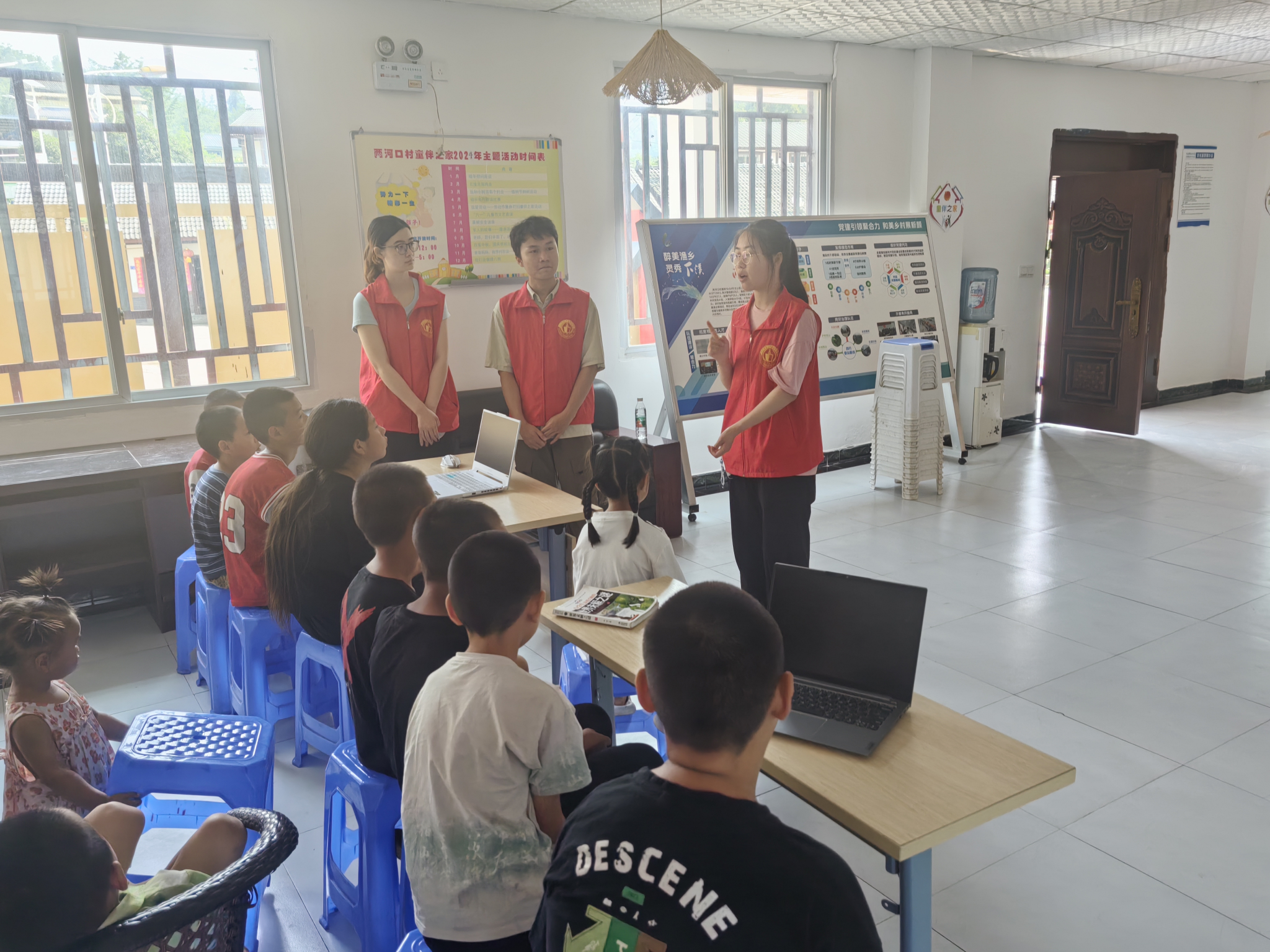 7月17日,两河口村小学的教室里充满欢声笑语,团队为留守儿童开设的“动物科普趣味课”热闹开课。队员们用彩色图片制作畜禽图鉴,结合视频演示,生动讲解“小鸡如何长大”“猩猩在哪里生活”等知识。“小朋友们,要是被小猫、小狗咬到或者抓到,哪怕伤口很小,也要告诉爸爸妈妈,及时去打狂犬疫苗哦。这样能保护我们不生病,快快好起来~”队员举起手模仿注射器,孩子们瞪大眼睛认真听讲。互动环节中,“你画我猜”“动物传声筒”等游戏让课堂气氛高涨。游戏过程中,孩子们用声音模仿小鱼、小鸭,用言语描绘家乡的养殖场。“我要把这些知识带回家告诉爷爷奶奶,告诉他们怎么养,小鸡才能长得更好!”二年级学生在听科普的时候说。短短两小时,课堂成为知识与欢乐的海洋,更在孩子们心中种下关注家乡产业的种子。