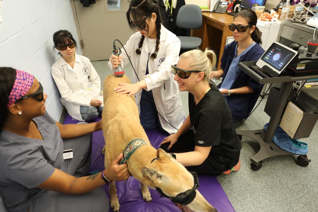 同样值得一提的是,除了学术上的严谨,美国兽医们都把动物当做自己的家人。让研究生周子含印象最深的科室便是与神经科紧密相连的康复科,每天都有很多动物在家人的陪伴来医院进行康复治疗,医生们会根据动物的不同个体情况制定不同的方案。例如激光疗法、水下跑步机、按摩、针灸等。正是医生们的一丝不苟和永不退减的热情让动物们一点点的恢复身体机能、提升生活质量。“这是值得我由衷敬佩和学习的。”