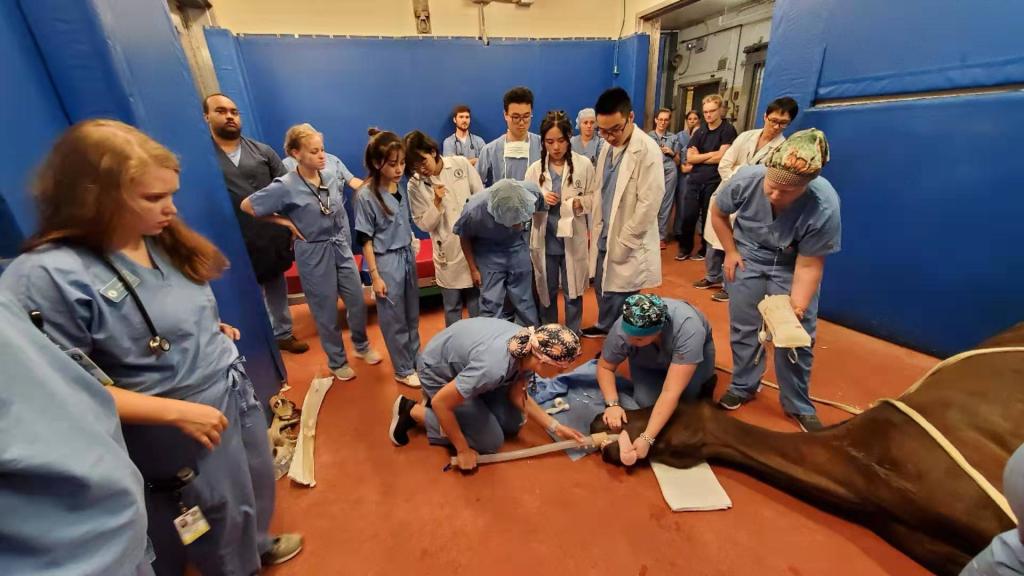 不仅如此,同学们这次实习还都安排参与普渡大学4年级DVM(执业兽医博士)学生的presentation(学习报告),从课前的大量预习、论文阅读,到演示幻灯片的制作、排练,再到课堂上的汇报、演讲,甚至为一个观点跟同学和教授们的“唇枪舌战”,让实习学生在感受美国课堂上“学生是主角”的过程中,充分了解美国兽医学生的培养过程。此外,大家还参与畜主捐赠给医院的skate(马匹)的临床技能操作,添加了不少个性化的实操锻炼机会。