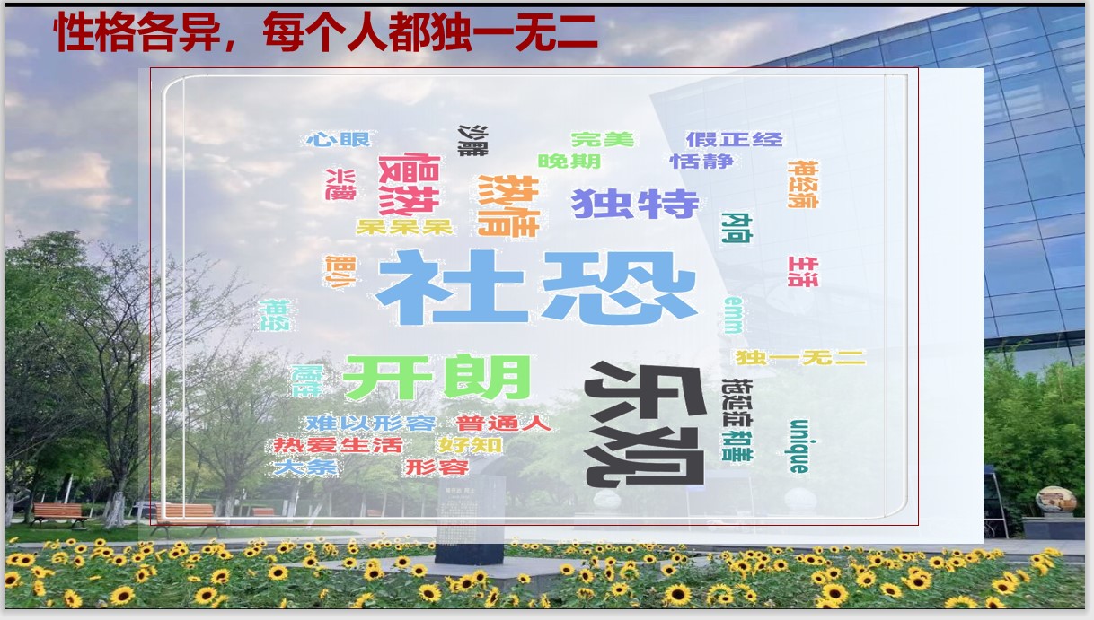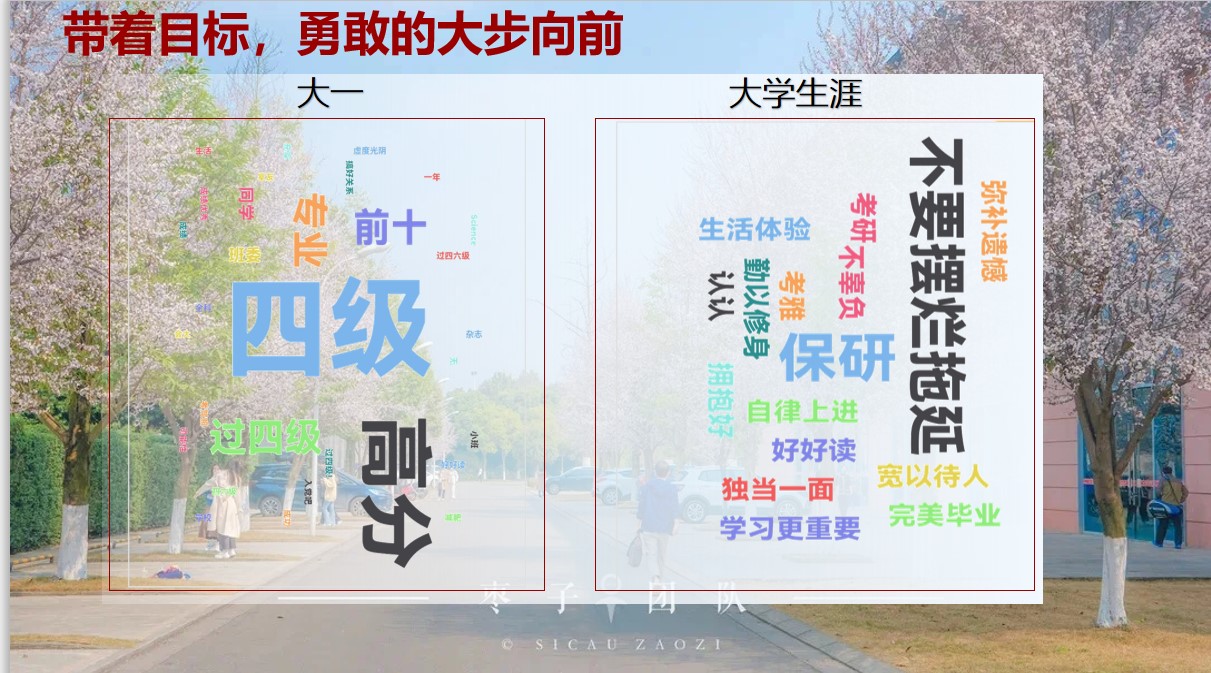 前期小班通过问卷收集了同学们的籍贯、性格、生活照、大一目标以及大学目标等基本信息,班主任老师将同学照片与中国地图链接起来,来自天南海北五湖四海,但最终汇聚一起,增强同学们的集体认同感;通过展示同学们多样化的性格,引导每位同学认识自己的独特,展示大一目标以及大学目标词云汇总则是希望同学们能够在大学生涯里牢记初心,大步向前。通过介绍,让同学们更加了解班级、认可班级,增强班级凝聚力,为树立良好班风班纪、建立和谐班级奠定良好基础。
