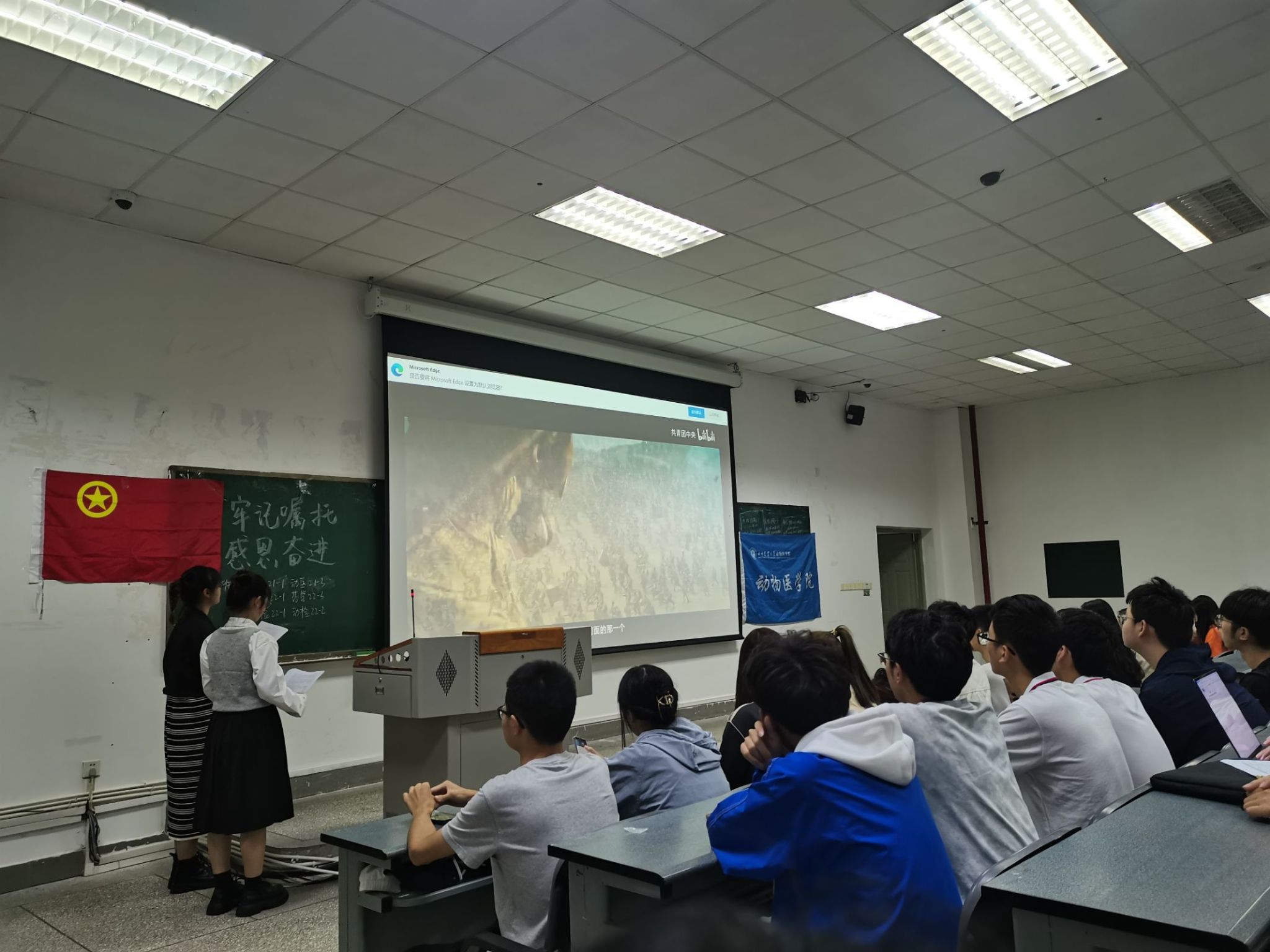 最后,支部成员们进行了“百年校史”的学习。两位主持人介绍了川农大发展史,川农大精神以及川农大优秀校友,最后为支部成员们播放了川农大的校歌视频,向支部成员们展示了“百年校史,弦歌不辍”的川农大。