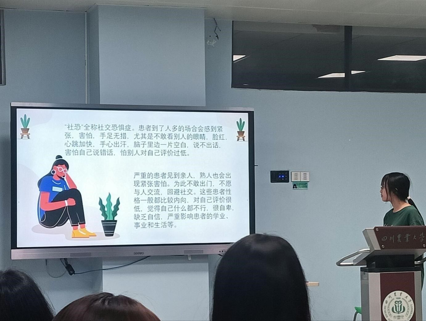 随后,主持人邓雨欣以“今天你社恐了吗”为切入点,通过图文并茂的讲解,深入剖析了社交恐惧现象。她详细阐述了社交恐惧的表现、原因及应对方法,同时穿插播放了相关心理视频,帮助成员们更全面地了解这一现象。邓雨欣的讲解不仅引导成员们正视自身的心理状况,还提供了摆脱社交困难的有效方法。