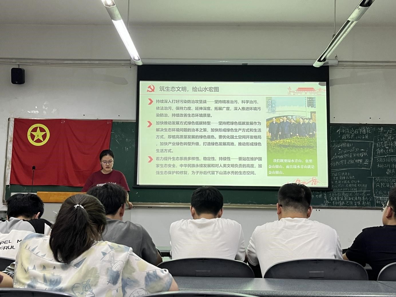 在“筑生态文明,绘山水宏图”主题学习中,全体成员跟着课件,认真学习习近平生态文明思想,牢固树立和践行绿水青山就是金山银山的理念;在第五部分,全体团员通过观看两个反邪教教育视频,学习邪教对人们带来的各种危害,随后又在主持人的带领下共同学习如何防范邪教,总体上达到“共唱反邪高歌,谱写青春乐章”的学习目的。最后,当嘹亮的团歌声再一次响起时,团日活动迎来了尾声。