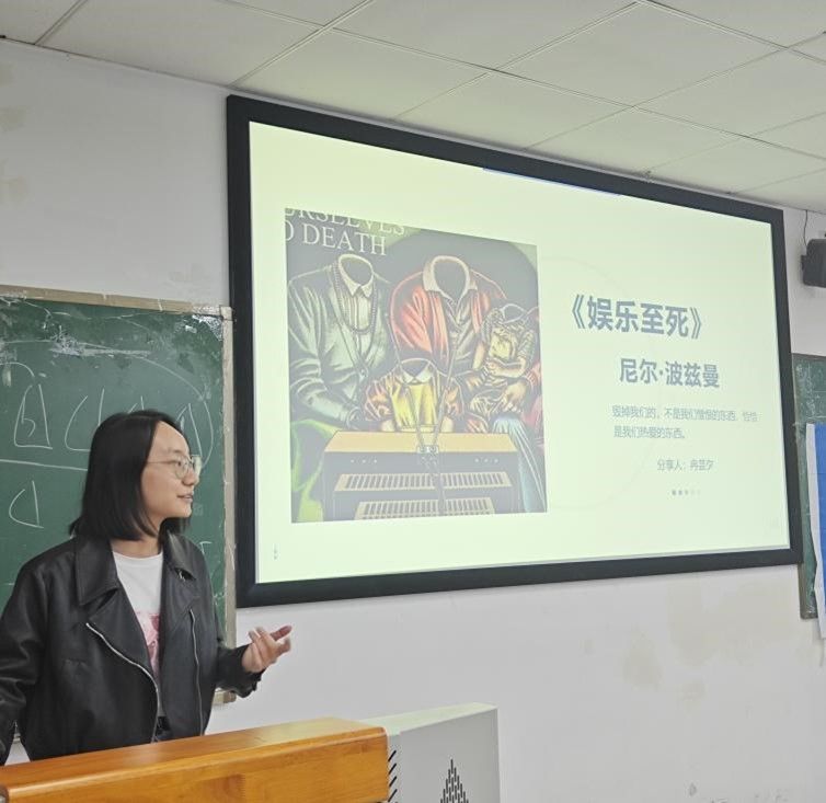 活动自筹备以来,便吸引了众多师生的目光,主办方共收到了23份精心筹备的作品。这些作品既有历史名著的深邃,也有现代小说的新颖;既有散文随笔的灵动,也有心理学、哲学的深邃。在众多分享中,冉芸夕对《娱乐至死》的解读尤为引人深思。她巧妙地将书中对“奶嘴文化”的论述与当下热门的“猫一杯”事件相结合,深入剖析了信息爆炸时代过度娱乐化对公众判断力的侵蚀。她的分享提醒大家在享受信息便利的同时,也要保持清醒的头脑,不被表象所迷惑。