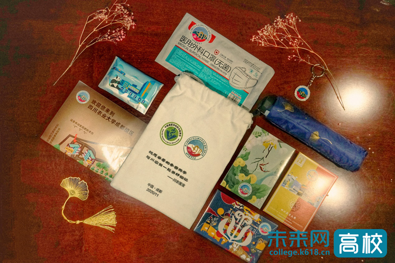 “祝愿亲爱的参赛同学与川农有一段美好回忆——川农医宝”拿到福袋,首先映入眼帘的是川农动医学子送给各校学友的祝福。打开福袋,里边除了有贴心准备的口罩、纸巾等防疫或日常用品外,还有一份川农成都校区的手绘地图、校区所在温江地区的生活地图、一枚精致的银杏叶书签、一块有印有大赛赛徽钥匙扣,以及一套手绘有川农三个校区标志建筑物或打卡地的明信片。
