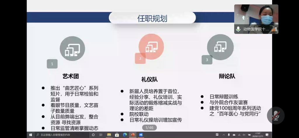 会议伊始,相关负责同学分别对第十三届学生党建工作和第十三届团学工作做述职报告。