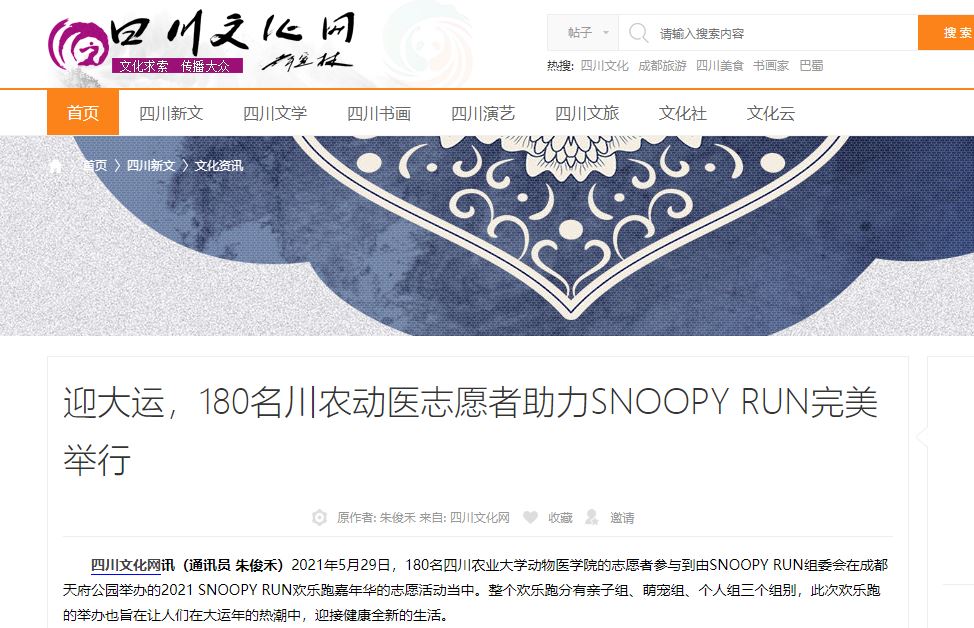 四川文化网讯(通讯员 朱俊禾)2021年5月29日,180名bat365官方网站的志愿者参与到由SNOOPY RUN组委会在成都天府公园举办的2021 SNOOPY RUN欢乐跑嘉年华的志愿活动当中。整个欢乐跑分有亲子组、萌宠组、个人组三个组别,此次欢乐跑的举办也旨在让人们在大运年的热潮中,迎接健康全新的生活。