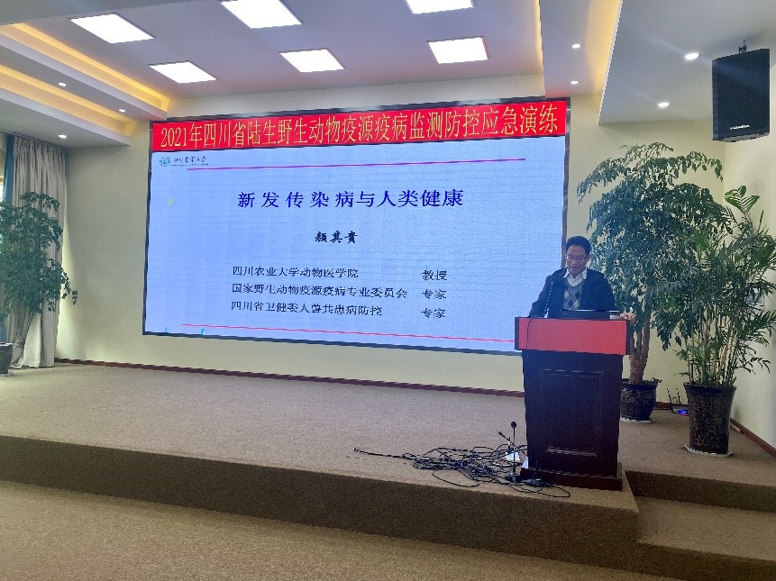 2021年10月11日-13日,预防兽医学系教授颜其贵率团队青年教师赵珊博士及研究生,参加四川省林业与草原局野生动植物资源保护站在四川卧龙举办的野动物疫源疫病监测防控应急演练培训。培训中颜其贵做了题为“野生动物疾病与人类健康”的专题报告;作为应急演练指挥中心的采样组指导人员赵珊率研究生进行模拟发现异常野生动物死亡的样本采集操作及人员防护示范演练工作。