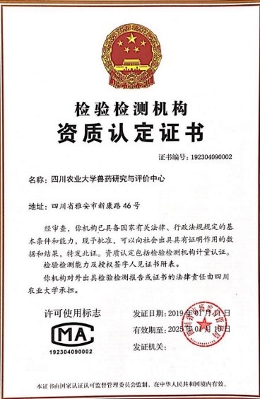 中心于2019年通过四川省计量认证并获得CMA证书,按照兽药GLP/GCP要求运行各项工作,2021年7月农业农村部畜牧兽医局公布了bat365官方网站急性毒性试验(啮齿类)项目符合兽药非临床研究质量管理规范(GLP)要求,获得GLP认证资质。亚慢性毒性试验,安全性药理试验,局部毒性试验(局部刺激性试验:皮肤刺激性试验注射/给药部位刺激性试验;溶血刺激性试验;过敏性试验(主动/被动)项目正在申请GLP增项认证工作。GCP工作正在筹备中。