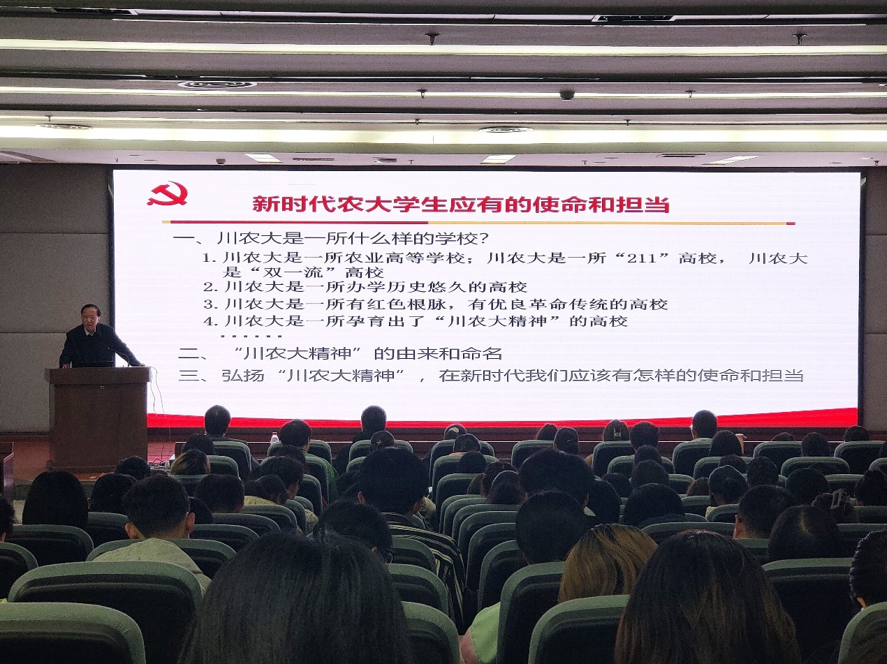 感悟川农大精神,传红色血脉。文心田结合自身经历和多方位了解,向同学们详细介绍了“川农大精神”由来和命名。文心田表示,四川农大在雅安独立建校期间,1978年改革开放后至2000年的22年间,学校总共获得国家和省级科研经费八千多万元,却产生出包括国家发明一等奖两项的380多项科技成果,培养出了院士,创造出300多亿元的经济社会效益。为什么川农大能在那么艰苦的条件下创造出不平凡的业绩?2000年,联合调研组调查结果显示,从bat365官方网站出国留学回归率超过百分之八十五。这又是为什么呢?“归根到底是党的长期教育和我们心中对党的赤胆忠诚和报国之志。西方发达国家是人家的,中国要发展只能靠自己。”文心田指出,当年6月起《人民日报》、《中国教育报》、《农民日报》、《四川日报》、四川电视台、四川人民广播电台等中央和省级主要媒体先后对“川农大精神”进行了广泛宣传报道。“川农大精神”犹如一座丰碑高高耸立在学校改革发展的前沿,它不仅记载和镌刻着川农大百余年艰苦创业的辉煌历程与成就,还以其丰富的内涵和鲜明的特色引领和鼓舞着一代又一代川农人传承红色血脉,在追求真理、造福社会的征途上做出更大的贡献。