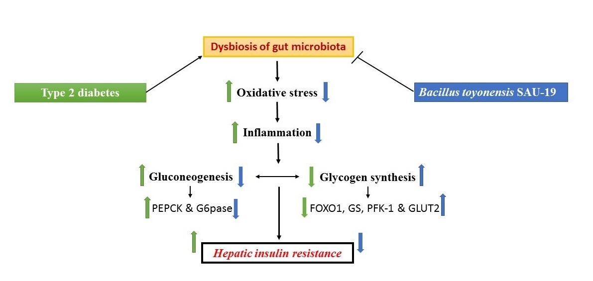 胰岛素抵抗(IR)是2型糖尿病(T2DM)的标志。本研究探讨了东洋芽孢杆菌SAU-19对2型糖尿病(T2DM)小鼠的抗糖尿病作用及其可能的作用机制。研究表明,东洋芽孢杆菌SAU-19能显著改善小鼠血糖水平和肝脏胰岛素抵抗,且肝脏的形态学变化以肝脏血脂异常、糖原合成和抗氧化状态的显著改善为特征,表明该菌株对T2DM患者的肝胰岛素抵抗有改善作用。综上所述,东洋芽孢杆菌SAU-19通过降低胰岛素抵抗、改善抗氧化状态、下调葡萄糖合成相关基因来抑制T2DM。因此,它可能被用于治疗糖尿病和其他代谢紊乱病。本成果为进一步深入研究东洋芽孢杆菌SAU-19治疗2型糖尿病的分子机制提供了基础。