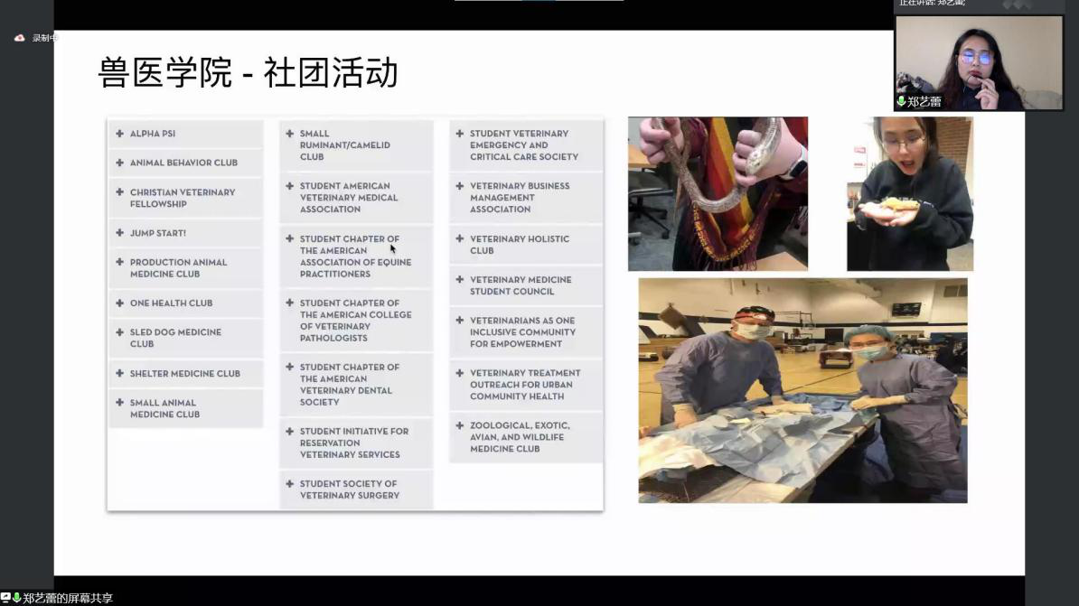 12月21日上午,目前西南地区高校唯二的国家留学基金委DVM(中美联合培养职业兽医博士)项目入选者、往届优秀学生标兵郑艺蕾和李丹钦以“医路领航——优标带你看世界”为题,与动医师生云端连线,结合两位校友大学期间和在美国求学期间技能学习、临床实践、科学研究、社会活动经历,以及当下前沿兽医领域最新动态等,为350余名学生学好专业技能、全面打造自我分享自己的经验和建议。