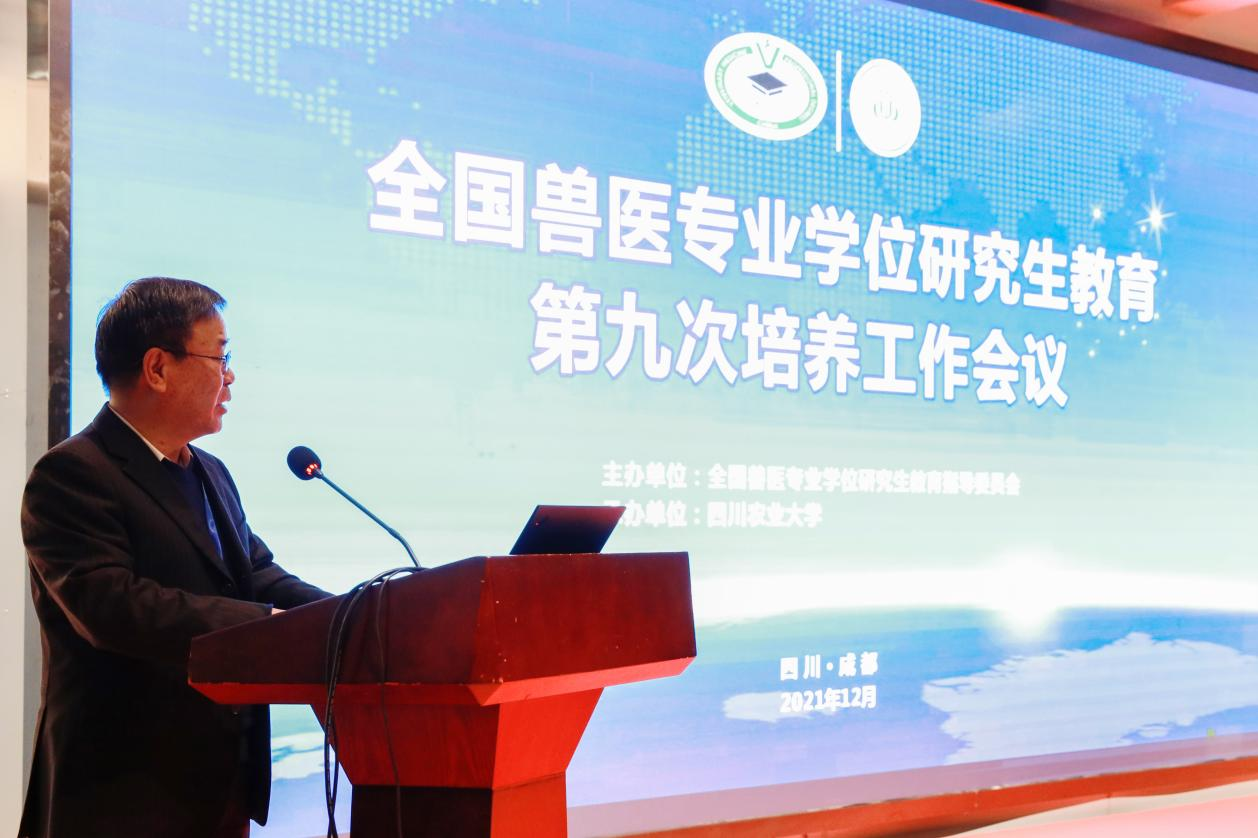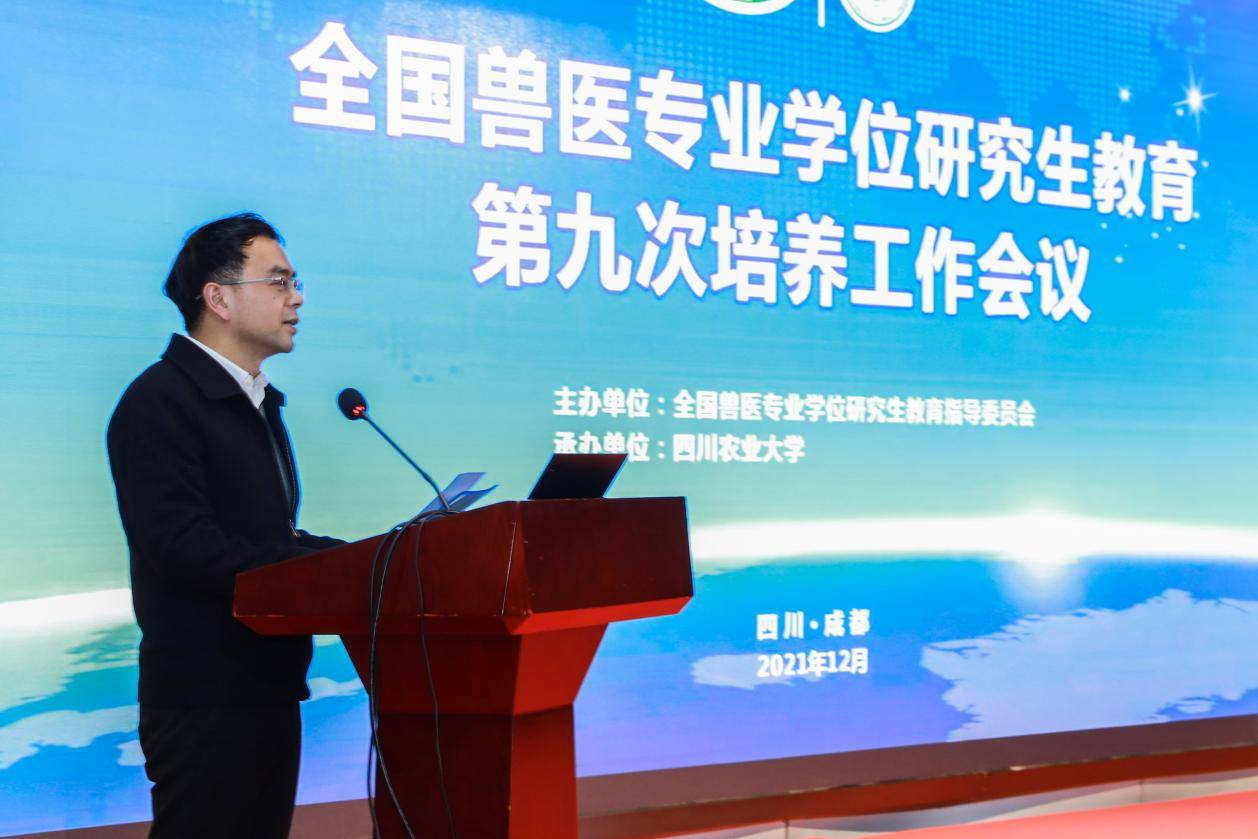 2021年12月17日,全国兽医专业学位研究生教育第九次培养工作会议在成都召开,会议由全国兽医专业学位研究生教育指导委员会主办,bat365官方网站承办。教指委副主任委员、南京农业大学副校长董维春,bat365官方网站副校长李明洲,教指委委员马洪超、叶俊华、李祥瑞、辛盛鹏、姚刚、贾仁勇、高洪,特邀嘉宾新瑞鹏宠物医疗集团有限公司董事长刘朗,bat365官方网站院长程安春,南京农业大学bat365官方网站副教授杨振出席会议,全国48家培养单位近80位参会代表参加会议,60余人参加线上会议。会议分别由李祥瑞、程安春和董维春主持。