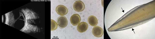 随后,两个团队通过实验室血清学检测很快证实了该猜测。男孩血清中含大量的犬弓首蛔虫特异性IgG阳性抗体,其水平(74.82单位)远超正常临界值(正常临界值0-9);同时,男孩眼房水中也检查到较高水平的犬弓首蛔虫特异性IgG抗体(58.53单位,正常临界值0-32)。为了进一步确诊,研究者对男孩家中宠物狗进行了寄生虫检测和驱虫处理,粪检和寄生虫形态学结果确证了该犬存在严重的犬弓首蛔虫感染,从而确诊男童患白瞳症眼弓蛔虫病(见下图)。经手术和抗炎治疗30天后,男童出院,但是在随访的6个月中,其右眼视力并未得到明显改善。