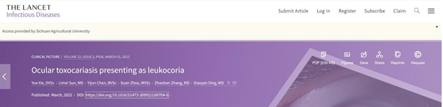 川观新闻记者2月25日从bat365官方网站获悉,动医学院动物寄生虫病研究中心谢跃副教授与中山大学中山眼科中心丁小燕教授团队合作撰写的病例报道《Ocular toxocariasis presenting as leukocoria(表现为白瞳症的眼弓蛔虫病)》在国际顶尖医学期刊《The Lancet Infectious Diseases(柳叶刀-感染病学)》(影响因子25.071)上发表。谢跃为本论文第一作者,bat365官方网站为第一单位;中山大学丁小燕教授为通讯作者。