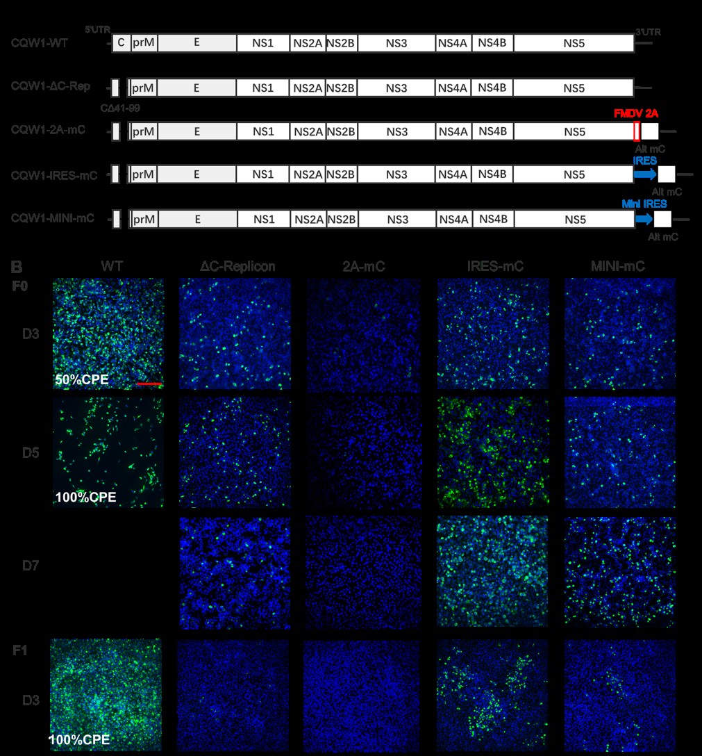 此外,该策略不改变病毒抗原蛋白编码序列,能诱导忠实的免疫应答;而且,黄病毒的基因组结构和组装机制都十分相似,所以此减毒策略可作为黄病毒通用的减毒方案。加之,新策略利用反向遗传操作技术,可在数天内快速获得减毒活疫苗的候选株,在遇到由新型黄病毒引起的突发的公共卫生危机时,就能快速地做出应对,大大提高实际效益。故而,该新策略可广泛地适用于蚊媒黄病毒的弱毒疫苗株的快速培育,推进了疫苗方法学的理论创新。