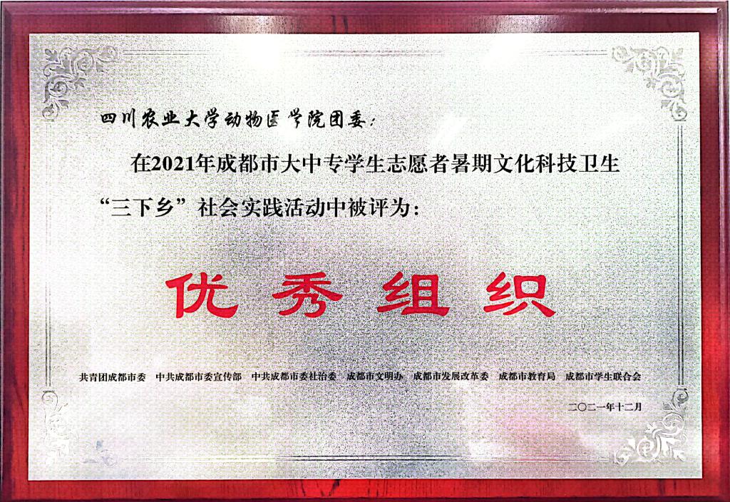 近日,从团成都市委获悉获悉,学院团委因在学生暑期社会实践工作中的良好组织,获共青团成都市委、成都市委宣传部、成都市委组织部、成都市发改委、成都市教育局、成都市学联联合表彰,获评“优秀组织”。