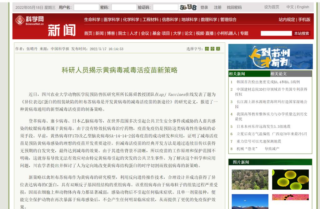 登革病毒、寨卡病毒、日本乙脑病毒等,在世界范围多次引起公共卫生安全事件或威胁的人畜共感染的蚊媒病毒都属于黄病毒。由于没有特效抗病毒治疗药物,疫苗免疫仍是预防这类病毒性传染病的必须手段。早前,黄热病毒YF17D及乙型脑炎病毒SA-14-14-2弱毒疫苗的成功研发和应用,证明了减毒活疫苗是预防黄病毒感染的理想的疫苗开发重要途径。但减毒活疫苗的经典开发方法是通过连续盲传以获得无预期的自发突变,最终达到减毒的效果。由于其遗传背景不清晰,所以疫苗的工作原理和保护范围不明确,这就容易导致无法有效应对由特定黄病毒引起的突发的公共卫生事件。为了解决这个科学和应用问题,川农学者提出并探讨了人为定向地改变黄病毒结构蛋白的时序切割而致弱病毒的新策略。