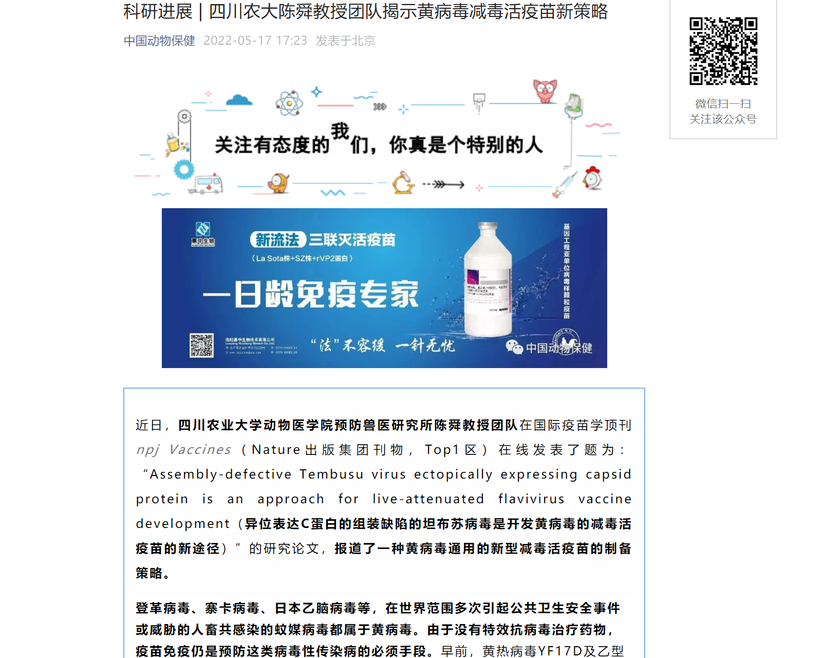 据悉,该研究于在npj Vaccines在线发表后(https://doi.org/10.1038/s41541-022-00468-y),德国知名科学产业网站“The great turning”就随即报道了本研究的新成果(https://www.thegreatturning.net/meeting-defective-tembusu-virus-ectopically-expressing-capsid-protein-is-an-strategy-for-live-attenuated-flavivirus-vaccine-improvement/)。