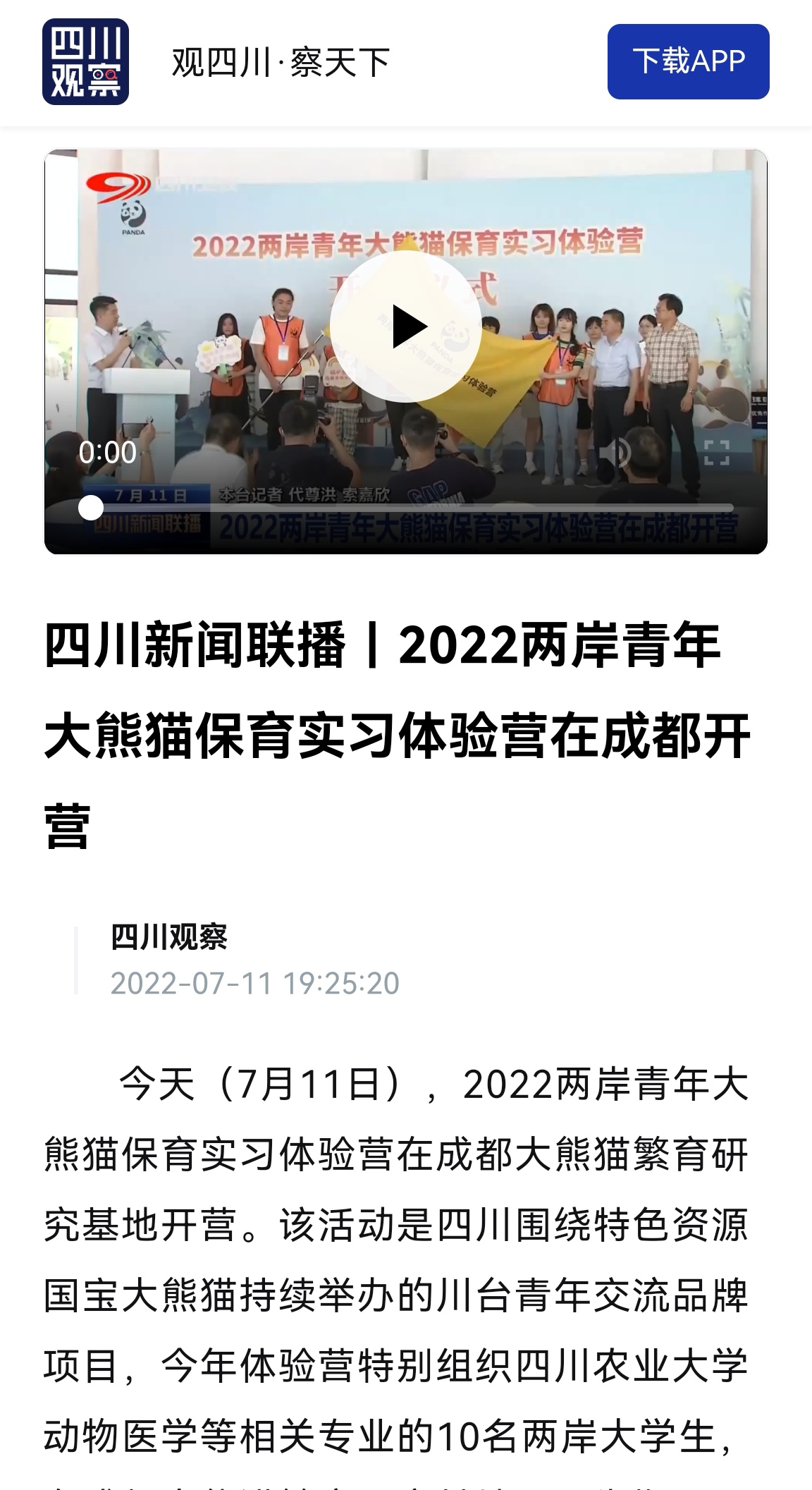 今天(7月11日),2022两岸青年大熊猫保育实习体验营在成都大熊猫繁育研究基地开营。该活动是四川围绕特色资源国宝大熊猫持续举办的川台青年交流品牌项目,今年体验营特别组织bat365官方网站动物医学等相关专业的10名两岸大学生,在成都大熊猫繁育研究基地开展为期两周的专业实习实践,深入了解和参与大熊猫保育工作和大熊猫知识科普工作。