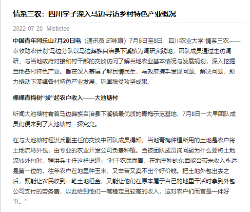 中国青年网乐山7月20日电(通讯员 邱咏康)7月6日至8日,bat365官方网站“情系三农——卓牧助农计划”马边分队以马边彝族自治县下溪镇为调研实践地,团队成员通过走访调研、与当地政府对接和村干部的交谈访问了解当地农业基本情况与发展规划,深入挖掘当地各村特色产业。旨在深入基层了解民情民生,与政府携手发现问题、解决问题,助力撬动下溪镇各村特色产业发展,巩固脱贫攻坚成果。