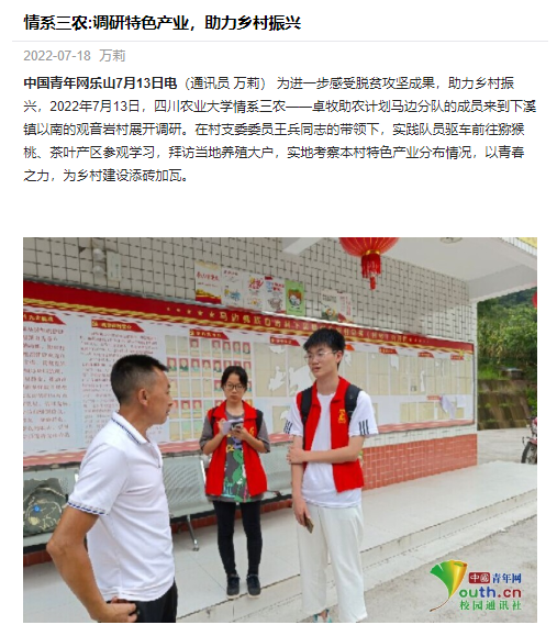 中国青年网乐山7月13日电(通讯员 万莉) 为进一步感受脱贫攻坚成果,助力乡村振兴,2022年7月13日,bat365官方网站情系三农——卓牧助农计划马边分队的成员来到下溪镇以南的观音岩村展开调研。在村支委委员王兵同志的带领下,实践队员驱车前往猕猴桃、茶叶产区参观学习,拜访当地养殖大户,实地考察本村特色产业分布情况,以青春之力,为乡村建设添砖加瓦。