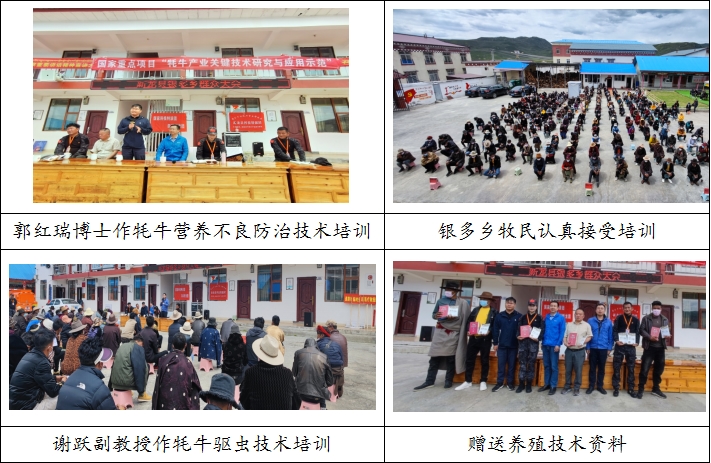 23日上午,与新龙县科技特派团团长董春生、农牧局王玉霞在银多乡为345户牦牛养殖户及数十名乡镇技术员开展牦牛健康养殖技术培训和疾病防控新技术培训。左之才教授、谢跃副教授及郭红瑞博士分别围绕牦牛常见病防控、牦牛常见寄生虫病防控、牦牛常见代谢病防控与牦牛补饲技术等主要内容进行了培训,并强调驱虫增重、营养补饲等新技术对提高牦牛养殖效益的重要性。