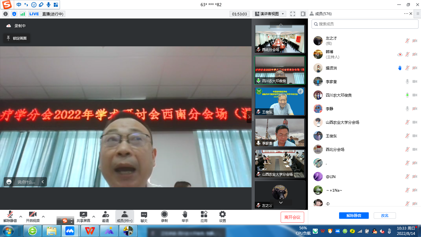 8月14日,由于疫情原因中国畜牧兽医学会兽医内科与临床诊疗学分会2022年举行线上学术研讨会。上午为大会主题报告,共有600余人参加。下午为各区域(东北地区、华北地区、西北地区、西南地区、华东地区以及中南地区)组织开展学术交流会。